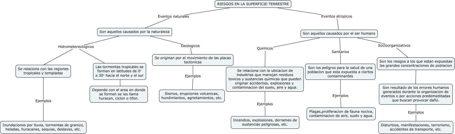 Este Cmap, tiene información relacionada con: Tipos de riesgos en la superficie terrestre, Son aquellos causados por el ser humano Quimicos Se relaciona con la ubicacion de industrias que manejan residuos toxicos y sustancias quimicas que pueden originar accidentes, explosiones y contaminacion del suelo, aire y agua., Son aquellos causados por la naturaleza Geologicos Se originan por el movimiento de las placas tectonicas, Son los peligros para la salud de una poblacion que esta expuesta a ciertos contaminantes Ejemplos Plagas,proliferacion de fauna nociva, contaminacion de aire, suelo y agua., Son resultado de los errores humanos generados durante la organizacion de eventos o por acciones predemeditadas que buscan provocar daño. Ejemplos Disturbios, manifestaciones, terrorismo, accidentes de transporte, etc., Las tormentas tropicales se forman en latitudes de 0° a 30° hacia el norte y el sur | Depende con el area en donde se formen se les llama huracan, ciclon o tifon., RIESGOS EN LA SUPERFICIE TERRESTRE Eventos atropicos Son aquellos causados por el ser humano, Son aquellos causados por el ser humano Socioorganizativos Son los riesgos a los que estan expuestas las grandes concentraciones de poblacion, Son aquellos causados por el ser humano Sanitarios Son los peligros para la salud de una poblacion que esta expuesta a ciertos contaminantes, Son los riesgos a los que estan expuestas las grandes concentraciones de poblacion ???? Son resultado de los errores humanos generados durante la organizacion de eventos o por acciones predemeditadas que buscan provocar daño., Son aquellos causados por la naturaleza Hidrometereologicos Se relaciona con las regiones tropicales y templadas, Se originan por el movimiento de las placas tectonicas Ejemplos Sismos, erupciones volcanicas, hundimientos, agrietamientos, etc., RIESGOS EN LA SUPERFICIE TERRESTRE Eventos naturales Son aquellos causados por la naturaleza, Son aquellos causados por la naturaleza Hidrometereologicos Las tormentas tropicales se forman en latitudes de 0° a 30° hacia el norte y el sur, Se relaciona con las regiones tropicales y templadas Ejemplos Inundaciones por lluvia, tormentas de granizo, heladas, huracanes, sequias, deslaves, etc., Se relaciona con la ubicacion de industrias que manejan residuos toxicos y sustancias quimicas que pueden originar accidentes, explosiones y contaminacion del suelo, aire y agua. Ejemplos Incendios, explosiones, derrames de sustancias peligrosas, etc.