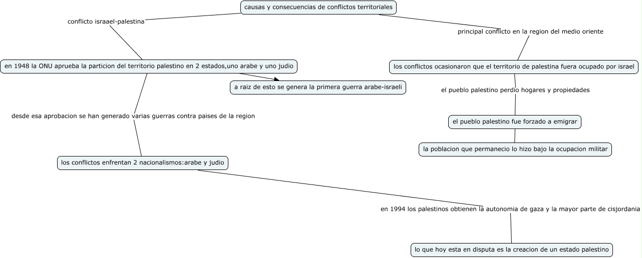 Este Cmap, tiene información relacionada con: causas y consecuencias 4, los conflictos enfrentan 2 nacionalismos:arabe y judio en 1994 los palestinos obtienen la autonomia de gaza y la mayor parte de cisjordania lo que hoy esta en disputa es la creacion de un estado palestino, causas y consecuencias de conflictos territoriales conflicto israael-palestina en 1948 la ONU aprueba la particion del territorio palestino en 2 estados,uno arabe y uno judio, en 1948 la ONU aprueba la particion del territorio palestino en 2 estados,uno arabe y uno judio ???? a raiz de esto se genera la primera guerra arabe-israeli, en 1948 la ONU aprueba la particion del territorio palestino en 2 estados,uno arabe y uno judio desde esa aprobacion se han generado varias guerras contra paises de la region los conflictos enfrentan 2 nacionalismos:arabe y judio, el pueblo palestino fue forzado a emigrar ???? la poblacion que permanecio lo hizo bajo la ocupacion militar, los conflictos ocasionaron que el territorio de palestina fuera ocupado por israel el pueblo palestino perdio hogares y propiedades el pueblo palestino fue forzado a emigrar, causas y consecuencias de conflictos territoriales principal conflicto en la region del medio oriente los conflictos ocasionaron que el territorio de palestina fuera ocupado por israel