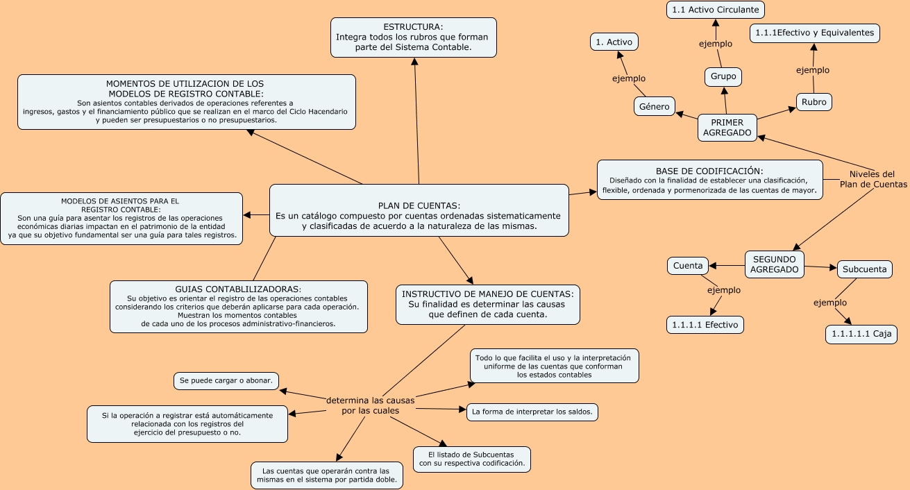 Este Cmap, tiene información relacionada con: plan de cuentas, Subcuenta ejemplo 1.1.1.1.1 Caja, Género ejemplo 1. Activo, INSTRUCTIVO DE MANEJO DE CUENTAS: Su finalidad es determinar las causas que definen de cada cuenta. determina las causas por las cuales Se puede cargar o abonar., Cuenta ejemplo 1.1.1.1 Efectivo, PLAN DE CUENTAS: Es un catálogo compuesto por cuentas ordenadas sistematicamente y clasificadas de acuerdo a la naturaleza de las mismas. ???? GUIAS CONTABLILIZADORAS: Su objetivo es orientar el registro de las operaciones contables considerando los criterios que deberán aplicarse para cada operación. Muestran los momentos contables de cada uno de los procesos administrativo-financieros., PLAN DE CUENTAS: Es un catálogo compuesto por cuentas ordenadas sistematicamente y clasificadas de acuerdo a la naturaleza de las mismas. MOMENTOS DE UTILIZACION DE LOS MODELOS DE REGISTRO CONTABLE: Son asientos contables derivados de operaciones referentes a ingresos, gastos y el financiamiento público que se realizan en el marco del Ciclo Hacendario y pueden ser presupuestarios o no presupuestarios., Grupo ejemplo 1.1 Activo Circulante, PRIMER AGREGADO Rubro, SEGUNDO AGREGADO Subcuenta, INSTRUCTIVO DE MANEJO DE CUENTAS: Su finalidad es determinar las causas que definen de cada cuenta. determina las causas por las cuales Las cuentas que operarán contra las mismas en el sistema por partida doble., PLAN DE CUENTAS: Es un catálogo compuesto por cuentas ordenadas sistematicamente y clasificadas de acuerdo a la naturaleza de las mismas. BASE DE CODIFICACIÓN: Diseñado con la finalidad de establecer una clasificación, flexible, ordenada y pormenorizada de las cuentas de mayor., INSTRUCTIVO DE MANEJO DE CUENTAS: Su finalidad es determinar las causas que definen de cada cuenta. determina las causas por las cuales Todo lo que facilita el uso y la interpretación uniforme de las cuentas que conforman los estados contables, PLAN DE CUENTAS: Es un catálogo compuesto por cuentas ordenadas sistematicamente y clasificadas de acuerdo a la naturaleza de las mismas. MODELOS DE ASIENTOS PARA EL REGISTRO CONTABLE: Son una guía para asentar los registros de las operaciones económicas diarias impactan en el patrimonio de la entidad ya que su objetivo fundamental ser una guía para tales registros., PLAN DE CUENTAS: Es un catálogo compuesto por cuentas ordenadas sistematicamente y clasificadas de acuerdo a la naturaleza de las mismas. ESTRUCTURA: Integra todos los rubros que forman parte del Sistema Contable., PRIMER AGREGADO Género, PRIMER AGREGADO Grupo, BASE DE CODIFICACIÓN: Diseñado con la finalidad de establecer una clasificación, flexible, ordenada y pormenorizada de las cuentas de mayor. Niveles del Plan de Cuentas SEGUNDO AGREGADO, Rubro ejemplo 1.1.1Efectivo y Equivalentes, PLAN DE CUENTAS: Es un catálogo compuesto por cuentas ordenadas sistematicamente y clasificadas de acuerdo a la naturaleza de las mismas. INSTRUCTIVO DE MANEJO DE CUENTAS: Su finalidad es determinar las causas que definen de cada cuenta., BASE DE CODIFICACIÓN: Diseñado con la finalidad de establecer una clasificación, flexible, ordenada y pormenorizada de las cuentas de mayor. Niveles del Plan de Cuentas PRIMER AGREGADO