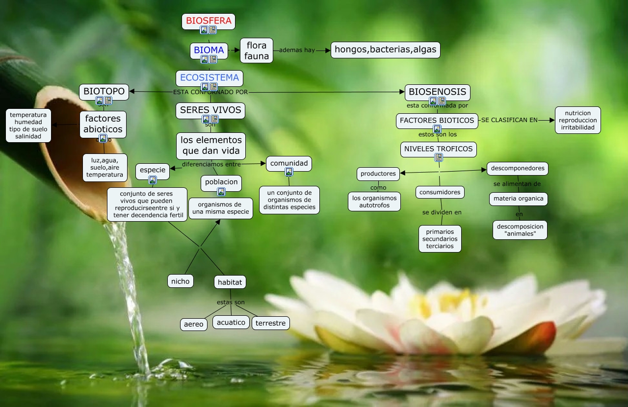 Este Cmap, tiene información relacionada con: kharla, materia organica en descomposicion "animales", habitat estas son acuatico, consumidores se dividen en primarios secundarios terciarios, BIOTOPO son factores abioticos, NIVELES TROFICOS productores, descomponedores se alimentan de materia organica, habitat estas son terrestre, ECOSISTEMA ESTA CONFORNADO POR BIOTOPO, habitat estas son aereo, factores abioticos temperatura humedad tipo de suelo salinidad, productores como los organismos autotrofos, FACTORES BIOTICOS SE CLASIFICAN EN nutricion reproduccion irritabilidad, BIOMA flora fauna, FACTORES BIOTICOS estos son los NIVELES TROFICOS, comunidad es un conjunto de organismos de distintas especies, ECOSISTEMA ESTA CONFORNADO POR BIOSENOSIS, SERES VIVOS son los elementos que dan vida, conjunto de seres vivos que pueden reproducirseentre si y tener decendencia fertil nicho, los elementos que dan vida diferenciamos entre comunidad, conjunto de seres vivos que pueden reproducirseentre si y tener decendencia fertil organismos de una misma especie