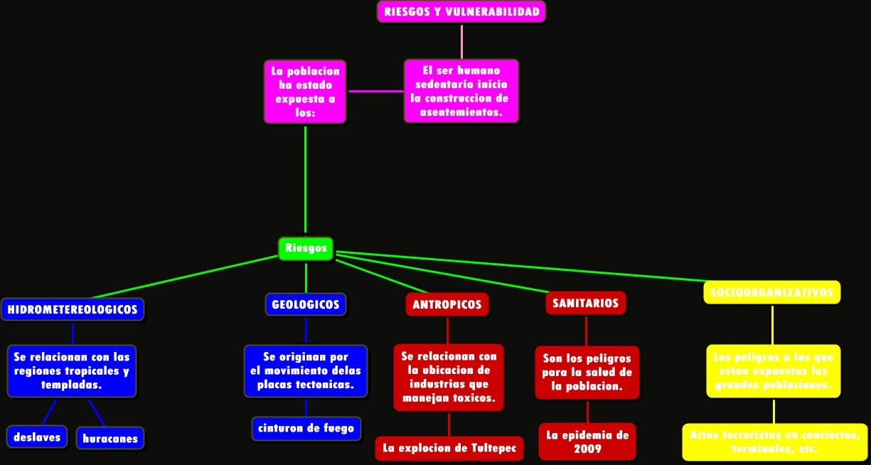 Este Cmap, tiene información relacionada con: Riesgos y vulnerabilidad, Riesgos ???? HIDROMETEREOLOGICOS, Los peligros a los que estan expuestas las grandes poblaciones. ???? Actos terroristas en conciertos, terminales, etc., Se relacionan con las regiones tropicales y templadas. ???? deslaves, Se originan por el movimiento delas placas tectonicas. ???? cinturon de fuego, ANTROPICOS ???? Se relacionan con la ubicacion de industrias que manejan toxicos., La poblacion ha estado expuesta a los: ???? Riesgos, Riesgos ???? SOCIOORGANIZATIVOS, Son los peligros para la salud de la poblacion. ???? La epidemia de 2009, HIDROMETEREOLOGICOS ???? Se relacionan con las regiones tropicales y templadas., Riesgos ???? ANTROPICOS, Se relacionan con las regiones tropicales y templadas. ???? huracanes, Riesgos ???? SANITARIOS, El ser humano sedentario inicio la construccion de asentemientos. ???? La poblacion ha estado expuesta a los:, Se relacionan con la ubicacion de industrias que manejan toxicos. ???? La explocion de Tultepec, SANITARIOS ???? Son los peligros para la salud de la poblacion., Riesgos ???? GEOLOGICOS, SOCIOORGANIZATIVOS ???? Los peligros a los que estan expuestas las grandes poblaciones., RIESGOS Y VULNERABILIDAD ???? El ser humano sedentario inicio la construccion de asentemientos., GEOLOGICOS ???? Se originan por el movimiento delas placas tectonicas.