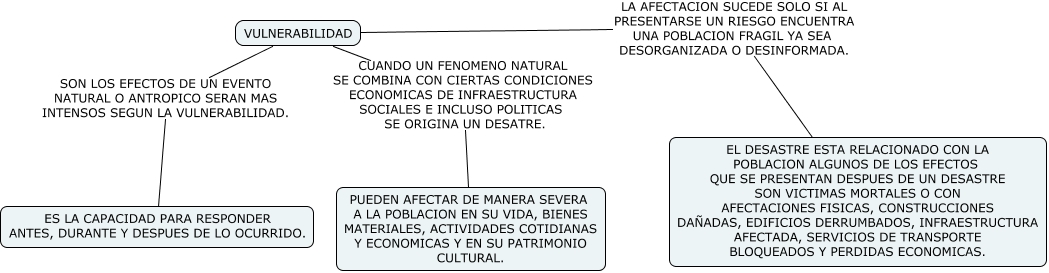 Este Cmap, tiene información relacionada con: VULNERABILIDAD, VULNERABILIDAD SON LOS EFECTOS DE UN EVENTO NATURAL O ANTROPICO SERAN MAS INTENSOS SEGUN LA VULNERABILIDAD. ES LA CAPACIDAD PARA RESPONDER ANTES, DURANTE Y DESPUES DE LO OCURRIDO., VULNERABILIDAD CUANDO UN FENOMENO NATURAL SE COMBINA CON CIERTAS CONDICIONES ECONOMICAS DE INFRAESTRUCTURA SOCIALES E INCLUSO POLITICAS SE ORIGINA UN DESATRE. PUEDEN AFECTAR DE MANERA SEVERA A LA POBLACION EN SU VIDA, BIENES MATERIALES, ACTIVIDADES COTIDIANAS Y ECONOMICAS Y EN SU PATRIMONIO CULTURAL., VULNERABILIDAD LA AFECTACION SUCEDE SOLO SI AL PRESENTARSE UN RIESGO ENCUENTRA UNA POBLACION FRAGIL YA SEA DESORGANIZADA O DESINFORMADA. EL DESASTRE ESTA RELACIONADO CON LA POBLACION ALGUNOS DE LOS EFECTOS QUE SE PRESENTAN DESPUES DE UN DESASTRE SON VICTIMAS MORTALES O CON AFECTACIONES FISICAS, CONSTRUCCIONES DAÑADAS, EDIFICIOS DERRUMBADOS, INFRAESTRUCTURA AFECTADA, SERVICIOS DE TRANSPORTE BLOQUEADOS Y PERDIDAS ECONOMICAS.