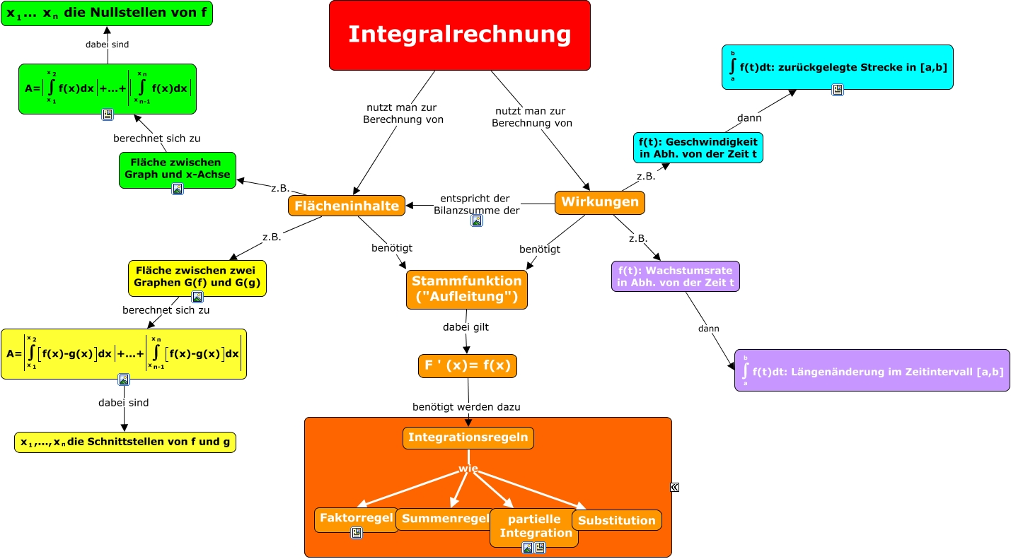 Dieses mit IHMC CmapTools erstellte CMap hat Informationen bezüglich: Integralrechung 1, Flächeninhalte z.B. Fläche zwischen Graph und x-Achse, F ' (x)= f(x) benötigt werden dazu Integrationsregeln, Wirkungen z.B. f(t): Geschwindigkeit in Abh. von der Zeit t, Fläche zwischen Graph und x-Achse berechnet sich zu <math xmlns="http://www.w3.org/1998/Math/MathML"> <mrow> <mtext> A= </mtext> <mfenced open="|" close=""> <mtext> </mtext> </mfenced> <munderover> <int/> <mrow> <mmultiscripts> <mtext> x </mtext> <mtext> 1 </mtext> <none/> </mmultiscripts> </mrow> <mrow> <mmultiscripts> <mtext> x </mtext> <mtext> 2 </mtext> <none/> </mmultiscripts> </mrow> </munderover> <mtext> f(x)dx </mtext> <mfenced open="" close="|"> <mtext> </mtext> </mfenced> <mtext> +...+ </mtext> <mfenced open="|" close=""> <mfenced open="|" close=""> <mtext> </mtext> </mfenced> <munderover> <int/> <mmultiscripts> <mtext> x </mtext> <mtext> n-1 </mtext> <none/> </mmultiscripts> <mmultiscripts> <mtext> x </mtext> <mtext> n </mtext> <none/> </mmultiscripts> </munderover> <mtext> f(x)dx </mtext> <mfenced open="" close="|"> <mtext> </mtext> </mfenced> </mfenced> </mrow> </math>, Flächeninhalte benötigt Stammfunktion ("Aufleitung"), <math xmlns="http://www.w3.org/1998/Math/MathML"> <mrow> <mtext> A= </mtext> <mfenced open="|" close=""> <munderover> <int/> <mmultiscripts> <mtext> x </mtext> <mtext> 1 </mtext> <none/> </mmultiscripts> <mmultiscripts> <mtext> x </mtext> <mtext> 2 </mtext> <none/> </mmultiscripts> </munderover> <mfenced open="[" close="]"> <mtext> f(x)-g(x) </mtext> </mfenced> </mfenced> <mtext> dx </mtext> <mfenced open="" close="|"> <mtext> </mtext> </mfenced> <mtext> +...+ </mtext> <mfenced open="|" close="|"> <munderover> <int/> <mmultiscripts> <mtext> x </mtext> <mtext> n-1 </mtext> <none/> </mmultiscripts> <mmultiscripts> <mtext> x </mtext> <mtext> n </mtext> <none/> </mmultiscripts> </munderover> <mfenced open="[" close="]"> <mtext> f(x)-g(x) </mtext> </mfenced> <mtext> dx </mtext> </mfenced> </mrow> </math> dabei sind <math xmlns="http://www.w3.org/1998/Math/MathML"> <mrow> <mmultiscripts> <mtext> x </mtext> <mtext> 1 </mtext> <none/> </mmultiscripts> <mtext> ,..., </mtext> <mmultiscripts> <mtext> x </mtext> <mtext> n </mtext> <none/> </mmultiscripts> <mtext> die Schnittstellen von f und g </mtext> </mrow> </math>, Integralrechnung nutzt man zur Berechnung von Wirkungen, Integrationsregeln wie partielle Integration, Stammfunktion ("Aufleitung") dabei gilt F ' (x)= f(x), f(t): Wachstumsrate in Abh. von der Zeit t dann <math xmlns="http://www.w3.org/1998/Math/MathML"> <mrow> <munderover> <int/> <mtext> a </mtext> <mtext> b </mtext> </munderover> <mtext> f(t)dt: Längenänderung im Zeitintervall [a,b] </mtext> </mrow> </math>, Wirkungen z.B. f(t): Wachstumsrate in Abh. von der Zeit t, Integralrechnung nutzt man zur Berechnung von Flächeninhalte, <math xmlns="http://www.w3.org/1998/Math/MathML"> <mrow> <mtext> A= </mtext> <mfenced open="|" close=""> <mtext> </mtext> </mfenced> <munderover> <int/> <mrow> <mmultiscripts> <mtext> x </mtext> <mtext> 1 </mtext> <none/> </mmultiscripts> </mrow> <mrow> <mmultiscripts> <mtext> x </mtext> <mtext> 2 </mtext> <none/> </mmultiscripts> </mrow> </munderover> <mtext> f(x)dx </mtext> <mfenced open="" close="|"> <mtext> </mtext> </mfenced> <mtext> +...+ </mtext> <mfenced open="|" close=""> <mfenced open="|" close=""> <mtext> </mtext> </mfenced> <munderover> <int/> <mmultiscripts> <mtext> x </mtext> <mtext> n-1 </mtext> <none/> </mmultiscripts> <mmultiscripts> <mtext> x </mtext> <mtext> n </mtext> <none/> </mmultiscripts> </munderover> <mtext> f(x)dx </mtext> <mfenced open="" close="|"> <mtext> </mtext> </mfenced> </mfenced> </mrow> </math> dabei sind <math xmlns="http://www.w3.org/1998/Math/MathML"> <mrow> <mmultiscripts> <mtext> x </mtext> <mtext> 1 </mtext> <none/> </mmultiscripts> <mtext> ... </mtext> <mmultiscripts> <mtext> x </mtext> <mtext> n </mtext> <none/> </mmultiscripts> <mtext> die Nullstellen von f </mtext> </mrow> </math>, Wirkungen entspricht der Bilanzsumme der Flächeninhalte, f(t): Geschwindigkeit in Abh. von der Zeit t dann <math xmlns="http://www.w3.org/1998/Math/MathML"> <mrow> <munderover> <int/> <mtext> a </mtext> <mtext> b </mtext> </munderover> <mtext> f(t)dt: zurückgelegte Strecke in [a,b] </mtext> </mrow> </math>, Integrationsregeln wie Summenregel, Integrationsregeln wie Substitution, Wirkungen benötigt Stammfunktion ("Aufleitung"), Flächeninhalte z.B. <math xmlns="http://www.w3.org/1998/Math/MathML"> <mrow> <mtext> Fläche zwischen zwei
