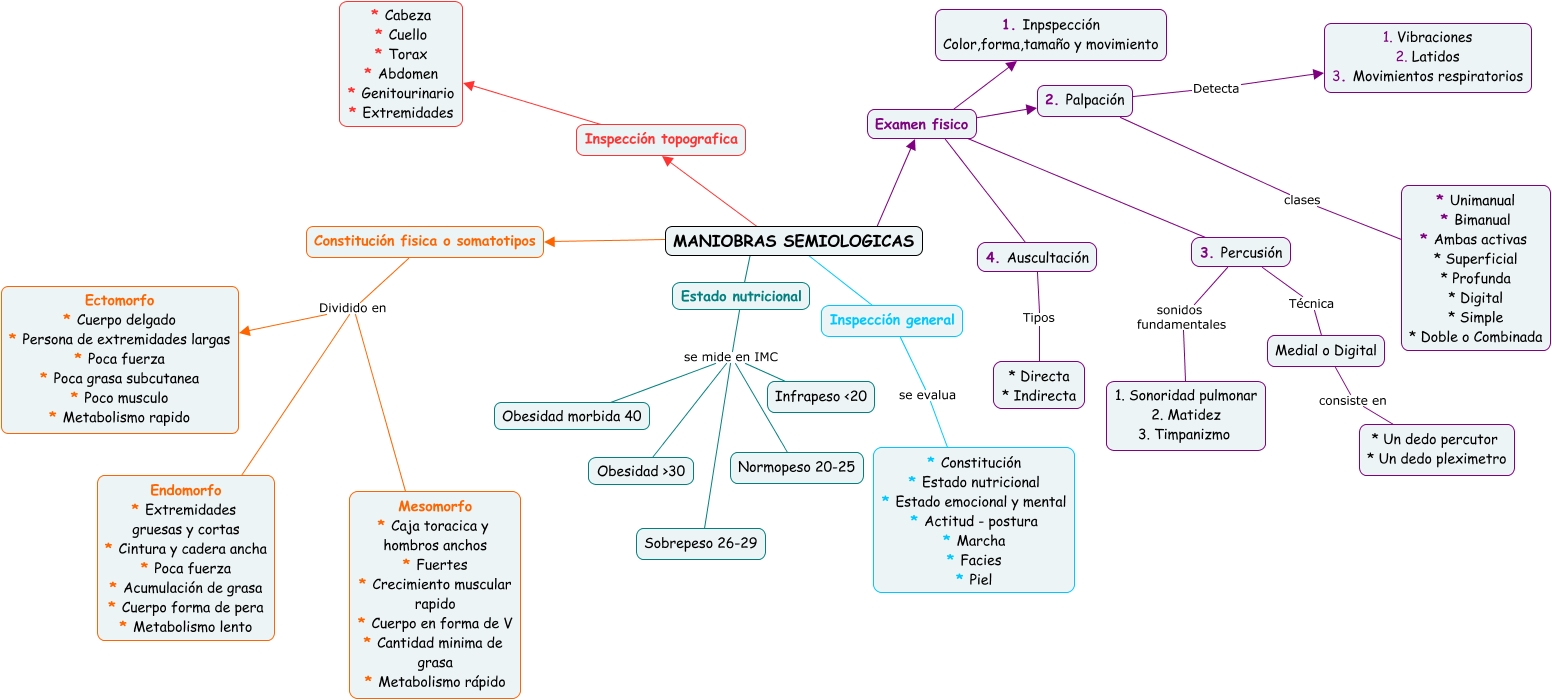Este Cmap, tiene información relacionada con: Maniobras semiologicas, Examen fisico ???? 1. Inpspección Color,forma,tamaño y movimiento, MANIOBRAS SEMIOLOGICAS ???? Examen fisico, Constitución fisica o somatotipos Dividido en Ectomorfo * Cuerpo delgado * Persona de extremidades largas * Poca fuerza * Poca grasa subcutanea * Poco musculo * Metabolismo rapido, Examen fisico ???? 3. Percusión, Medial o Digital consiste en * Un dedo percutor * Un dedo pleximetro, Estado nutricional se mide en IMC Obesidad ᡖ, Constitución fisica o somatotipos Dividido en Mesomorfo * Caja toracica y hombros anchos * Fuertes * Crecimiento muscular rapido * Cuerpo en forma de V * Cantidad minima de grasa * Metabolismo rápido, Estado nutricional se mide en IMC Normopeso 20-25, MANIOBRAS SEMIOLOGICAS ???? Constitución fisica o somatotipos, 2. Palpación clases * Unimanual * Bimanual * Ambas activas * Superficial * Profunda * Digital * Simple * Doble o Combinada, Estado nutricional se mide en IMC Infrapeso ង, Examen fisico ???? 4. Auscultación, Examen fisico ???? 2. Palpación, Estado nutricional se mide en IMC Obesidad morbida 40, 3. Percusión sonidos fundamentales 1. Sonoridad pulmonar 2. Matidez 3. Timpanizmo, 2. Palpación Detecta 1. Vibraciones 2. Latidos 3. Movimientos respiratorios, Inspección topografica ???? * Cabeza * Cuello * Torax * Abdomen * Genitourinario * Extremidades, 3. Percusión Técnica Medial o Digital, Inspección general se evalua * Constitución * Estado nutricional * Estado emocional y mental * Actitud - postura * Marcha * Facies * Piel, 4. Auscultación Tipos * Directa * Indirecta