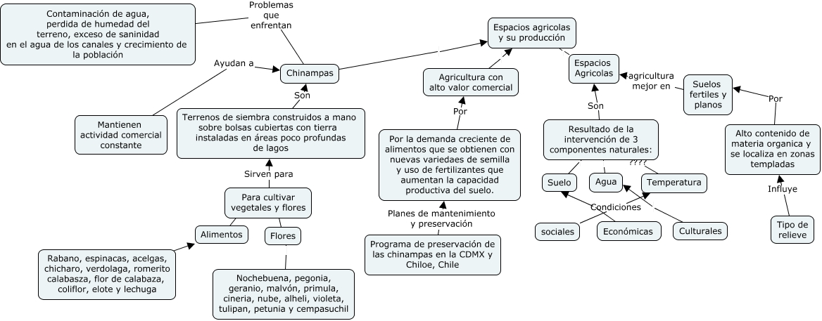 Este Cmap, tiene información relacionada con: Agricultura 1, Nochebuena, pegonia, geranio, malvón, primula, cineria, nube, alheli, violeta, tulipan, petunia y cempasuchil Flores, Económicas Suelo, Temperatura ???? Resultado de la intervención de 3 componentes naturales:, sociales Condiciones Temperatura, Chinampas Espacios agricolas y su producción, Tipo de relieve Influye Alto contenido de materia organica y se localiza en zonas templadas, Alto contenido de materia organica y se localiza en zonas templadas Por Suelos fertiles y planos, Programa de preservación de las chinampas en la CDMX y Chiloe, Chile Planes de mantenimiento y preservación Por la demanda creciente de alimentos que se obtienen con nuevas variedaes de semilla y uso de fertilizantes que aumentan la capacidad productiva del suelo., Suelo Resultado de la intervención de 3 componentes naturales:, Rabano, espinacas, acelgas, chicharo, verdolaga, romerito calabasza, flor de calabaza, coliflor, elote y lechuga ???? Alimentos, Agua Resultado de la intervención de 3 componentes naturales:, Terrenos de siembra construidos a mano sobre bolsas cubiertas con tierra instaladas en áreas poco profundas de lagos Son Chinampas, Mantienen actividad comercial constante Ayudan a Chinampas, Flores Para cultivar vegetales y flores, Contaminación de agua, perdida de humedad del terreno, exceso de saninidad en el agua de los canales y crecimiento de la población Problemas que enfrentan Chinampas, Para cultivar vegetales y flores Sirven para Terrenos de siembra construidos a mano sobre bolsas cubiertas con tierra instaladas en áreas poco profundas de lagos, Alimentos Para cultivar vegetales y flores, Resultado de la intervención de 3 componentes naturales: Son Espacios Agricolas, Espacios Agricolas Espacios agricolas y su producción, Culturales Agua