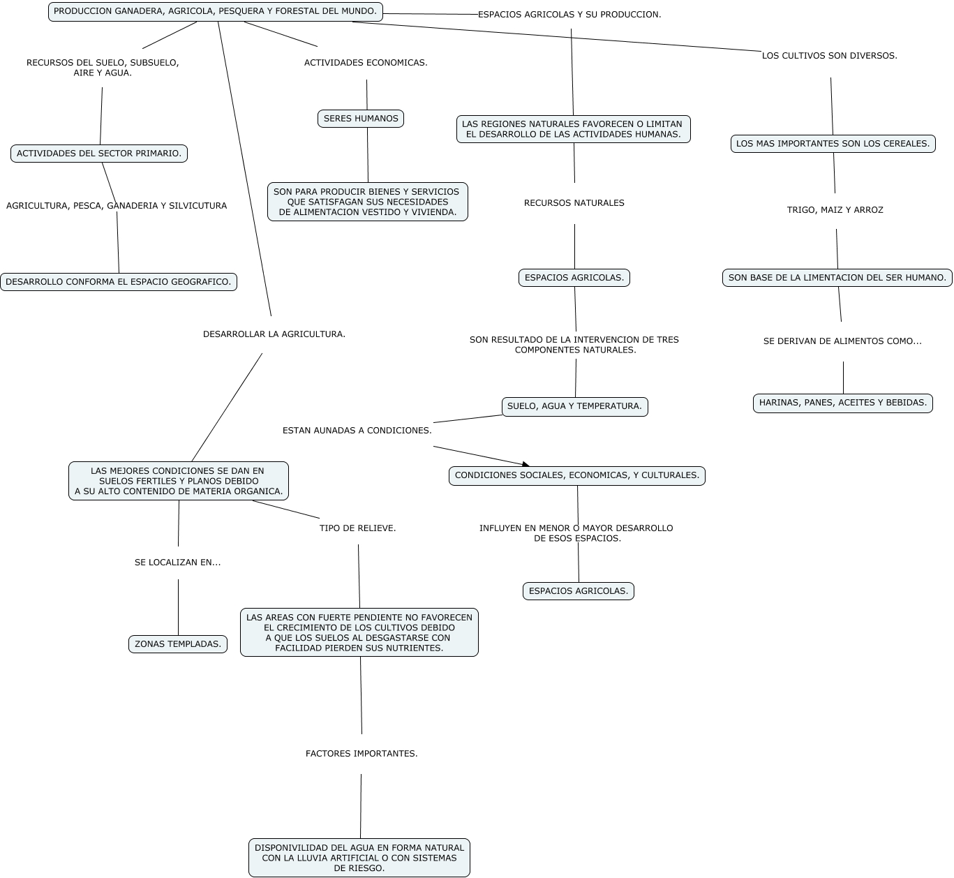 Este Cmap, tiene información relacionada con: PRODUCCION AGRICOLA, PRODUCCION GANADERA, AGRICOLA, PESQUERA Y FORESTAL DEL MUNDO. ACTIVIDADES ECONOMICAS. SON PARA PRODUCIR BIENES Y SERVICIOS QUE SATISFAGAN SUS NECESIDADES DE ALIMENTACION VESTIDO Y VIVIENDA., PRODUCCION GANADERA, AGRICOLA, PESQUERA Y FORESTAL DEL MUNDO. ESPACIOS AGRICOLAS Y SU PRODUCCION. LAS REGIONES NATURALES FAVORECEN O LIMITAN EL DESARROLLO DE LAS ACTIVIDADES HUMANAS., LOS MAS IMPORTANTES SON LOS CEREALES. TRIGO, MAIZ Y ARROZ SON BASE DE LA LIMENTACION DEL SER HUMANO., SUELO, AGUA Y TEMPERATURA. ESTAN AUNADAS A CONDICIONES. CONDICIONES SOCIALES, ECONOMICAS, Y CULTURALES., ESPACIOS AGRICOLAS. SON RESULTADO DE LA INTERVENCION DE TRES COMPONENTES NATURALES. SUELO, AGUA Y TEMPERATURA., LAS REGIONES NATURALES FAVORECEN O LIMITAN EL DESARROLLO DE LAS ACTIVIDADES HUMANAS. RECURSOS NATURALES ESPACIOS AGRICOLAS., PRODUCCION GANADERA, AGRICOLA, PESQUERA Y FORESTAL DEL MUNDO. DESARROLLAR LA AGRICULTURA. LAS MEJORES CONDICIONES SE DAN EN SUELOS FERTILES Y PLANOS DEBIDO A SU ALTO CONTENIDO DE MATERIA ORGANICA., PRODUCCION GANADERA, AGRICOLA, PESQUERA Y FORESTAL DEL MUNDO. RECURSOS DEL SUELO, SUBSUELO, AIRE Y AGUA. ACTIVIDADES DEL SECTOR PRIMARIO., LAS MEJORES CONDICIONES SE DAN EN SUELOS FERTILES Y PLANOS DEBIDO A SU ALTO CONTENIDO DE MATERIA ORGANICA. TIPO DE RELIEVE. LAS AREAS CON FUERTE PENDIENTE NO FAVORECEN EL CRECIMIENTO DE LOS CULTIVOS DEBIDO A QUE LOS SUELOS AL DESGASTARSE CON FACILIDAD PIERDEN SUS NUTRIENTES., CONDICIONES SOCIALES, ECONOMICAS, Y CULTURALES. INFLUYEN EN MENOR O MAYOR DESARROLLO DE ESOS ESPACIOS. ESPACIOS AGRICOLAS., PRODUCCION GANADERA, AGRICOLA, PESQUERA Y FORESTAL DEL MUNDO. LOS CULTIVOS SON DIVERSOS. LOS MAS IMPORTANTES SON LOS CEREALES., LAS AREAS CON FUERTE PENDIENTE NO FAVORECEN EL CRECIMIENTO DE LOS CULTIVOS DEBIDO A QUE LOS SUELOS AL DESGASTARSE CON FACILIDAD PIERDEN SUS NUTRIENTES. FACTORES IMPORTANTES. DISPONIVILIDAD DEL AGUA EN FORMA NATURAL CON LA LLUVIA ARTIFICIAL O CON SISTEMAS DE RIESGO., LAS MEJORES CONDICIONES SE DAN EN SUELOS FERTILES Y PLANOS DEBIDO A SU ALTO CONTENIDO DE MATERIA ORGANICA. SE LOCALIZAN EN... ZONAS TEMPLADAS., SON BASE DE LA LIMENTACION DEL SER HUMANO. SE DERIVAN DE ALIMENTOS COMO... HARINAS, PANES, ACEITES Y BEBIDAS., ACTIVIDADES DEL SECTOR PRIMARIO. AGRICULTURA, PESCA, GANADERIA Y SILVICUTURA DESARROLLO CONFORMA EL ESPACIO GEOGRAFICO.