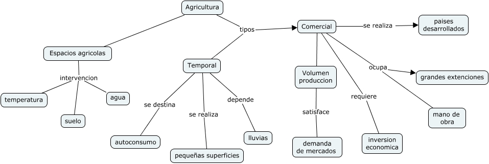 Este Cmap, tiene información relacionada con: Agricultura, Temporal depende lluvias, Espacios agricolas intervencion suelo, Agricultura ???? Espacios agricolas, Comercial ocupa mano de obra, Agricultura tipos Temporal, Agricultura tipos Comercial, Espacios agricolas intervencion agua, Temporal se realiza pequeñas superficies, Comercial satisface demanda de mercados, Comercial se realiza paises desarrollados, Comercial ocupa grandes extenciones, Comercial requiere inversion economica, Espacios agricolas intervencion temperatura, Temporal se destina autoconsumo