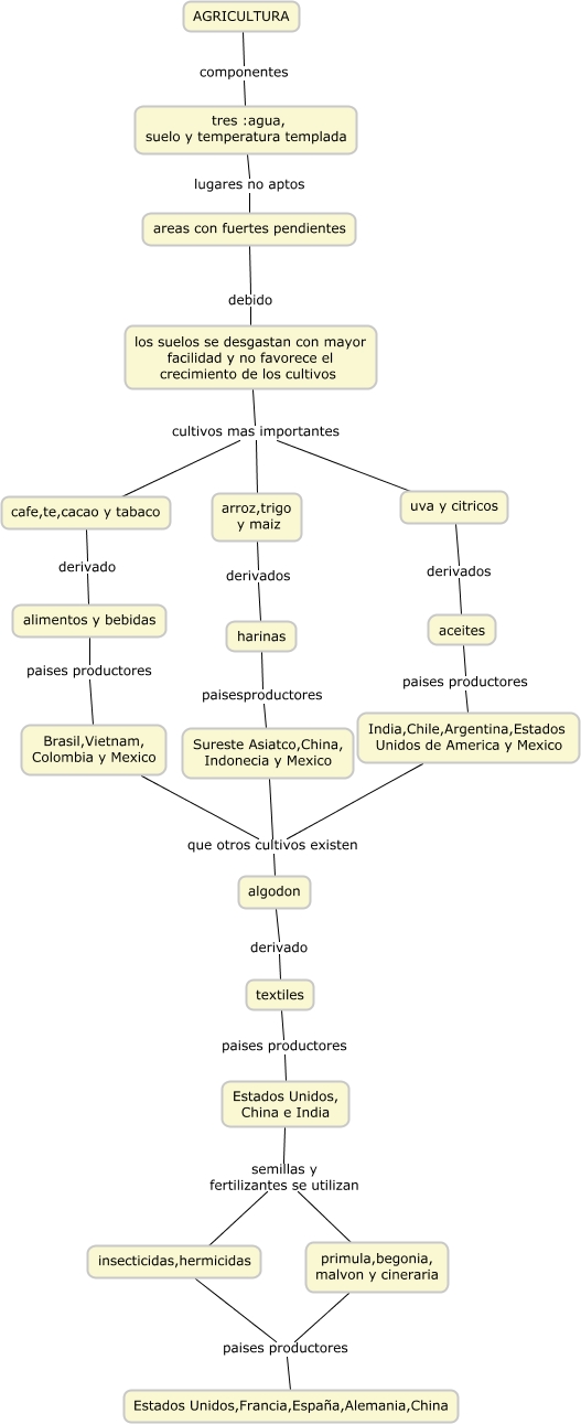 Este Cmap, tiene información relacionada con: agricultura, algodon derivado textiles, arroz,trigo y maiz derivados harinas, uva y citricos derivados aceites, Estados Unidos, China e India semillas y fertilizantes se utilizan insecticidas,hermicidas, Brasil,Vietnam, Colombia y Mexico que otros cultivos existen algodon, harinas paisesproductores Sureste Asiatco,China, Indonecia y Mexico, textiles paises productores Estados Unidos, China e India, los suelos se desgastan con mayor facilidad y no favorece el crecimiento de los cultivos cultivos mas importantes cafe,te,cacao y tabaco, alimentos y bebidas paises productores Brasil,Vietnam, Colombia y Mexico, insecticidas,hermicidas paises productores Estados Unidos,Francia,España,Alemania,China, cafe,te,cacao y tabaco derivado alimentos y bebidas, AGRICULTURA componentes tres :agua, suelo y temperatura templada, primula,begonia, malvon y cineraria paises productores Estados Unidos,Francia,España,Alemania,China, Sureste Asiatco,China, Indonecia y Mexico que otros cultivos existen algodon, tres :agua, suelo y temperatura templada lugares no aptos areas con fuertes pendientes, los suelos se desgastan con mayor facilidad y no favorece el crecimiento de los cultivos cultivos mas importantes uva y citricos, los suelos se desgastan con mayor facilidad y no favorece el crecimiento de los cultivos cultivos mas importantes arroz,trigo y maiz, aceites paises productores India,Chile,Argentina,Estados Unidos de America y Mexico, areas con fuertes pendientes debido los suelos se desgastan con mayor facilidad y no favorece el crecimiento de los cultivos, India,Chile,Argentina,Estados Unidos de America y Mexico que otros cultivos existen algodon