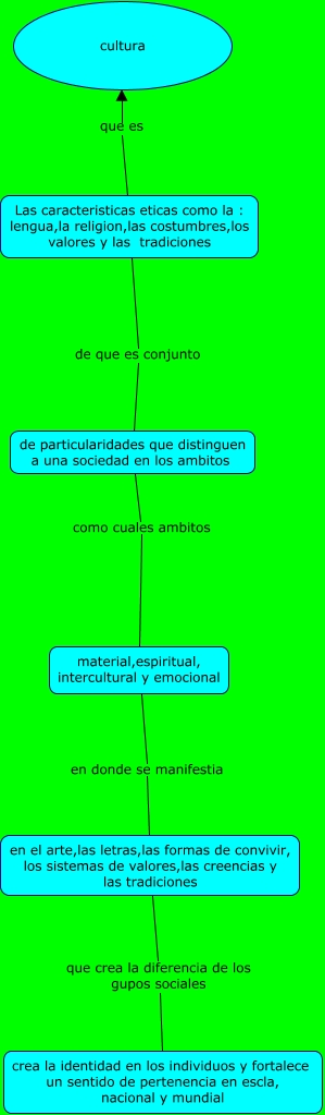 Este Cmap, tiene información relacionada con: cultura, de particularidades que distinguen a una sociedad en los ambitos como cuales ambitos material,espiritual, intercultural y emocional, material,espiritual, intercultural y emocional en donde se manifestia en el arte,las letras,las formas de convivir, los sistemas de valores,las creencias y las tradiciones, Las caracteristicas eticas como la : lengua,la religion,las costumbres,los valores y las tradiciones que es cultura, Las caracteristicas eticas como la : lengua,la religion,las costumbres,los valores y las tradiciones de que es conjunto de particularidades que distinguen a una sociedad en los ambitos, en el arte,las letras,las formas de convivir, los sistemas de valores,las creencias y las tradiciones que crea la diferencia de los gupos sociales crea la identidad en los individuos y fortalece un sentido de pertenencia en escla, nacional y mundial