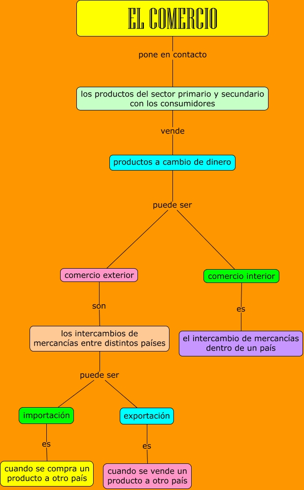 Este Cmap, tiene información relacionada con: El comercio, productos a cambio de dinero puede ser comercio interior, los productos del sector primario y secundario con los consumidores vende productos a cambio de dinero, comercio interior es el intercambio de mercancías dentro de un país, los intercambios de mercancías entre distintos países puede ser exportación, EL COMERCIO pone en contacto los productos del sector primario y secundario con los consumidores, importación es cuando se compra un producto a otro país, los intercambios de mercancías entre distintos países puede ser importación, exportación es cuando se vende un producto a otro país, productos a cambio de dinero puede ser comercio exterior, comercio exterior son los intercambios de mercancías entre distintos países