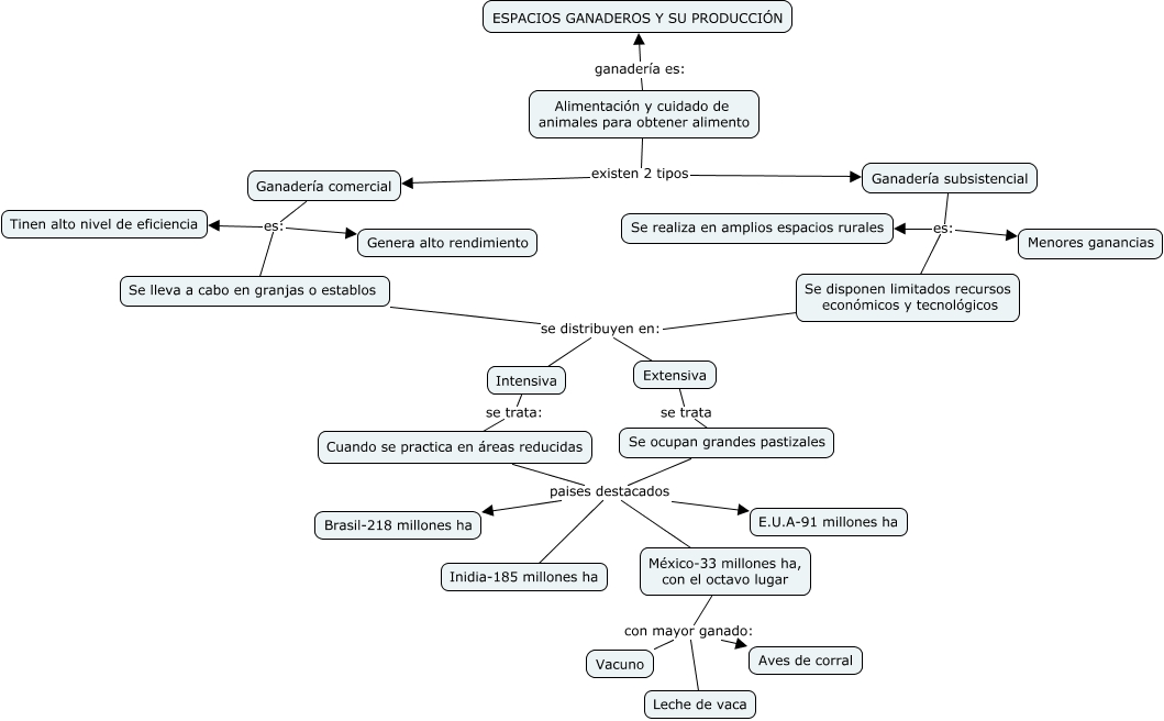 Este Cmap, tiene información relacionada con: Espacios ganaderos, Se disponen limitados recursos económicos y tecnológicos se distribuyen en: Intensiva, Cuando se practica en áreas reducidas paises destacados Brasil-218 millones ha, Intensiva se trata: Cuando se practica en áreas reducidas, México-33 millones ha, con el octavo lugar con mayor ganado: Vacuno, Se lleva a cabo en granjas o establos se distribuyen en: Extensiva, Ganadería comercial es: Genera alto rendimiento, Ganadería comercial es: Se lleva a cabo en granjas o establos, Se lleva a cabo en granjas o establos se distribuyen en: Intensiva, Se disponen limitados recursos económicos y tecnológicos se distribuyen en: Extensiva, México-33 millones ha, con el octavo lugar con mayor ganado: Aves de corral, Se ocupan grandes pastizales paises destacados E.U.A-91 millones ha, Ganadería subsistencial es: Se realiza en amplios espacios rurales, Alimentación y cuidado de animales para obtener alimento existen 2 tipos Ganadería subsistencial, Cuando se practica en áreas reducidas paises destacados E.U.A-91 millones ha, Alimentación y cuidado de animales para obtener alimento ganadería es: ESPACIOS GANADEROS Y SU PRODUCCIÓN, Se ocupan grandes pastizales paises destacados Inidia-185 millones ha, México-33 millones ha, con el octavo lugar con mayor ganado: Leche de vaca, Cuando se practica en áreas reducidas paises destacados México-33 millones ha, con el octavo lugar, Cuando se practica en áreas reducidas paises destacados Inidia-185 millones ha, Ganadería subsistencial es: Se disponen limitados recursos económicos y tecnológicos