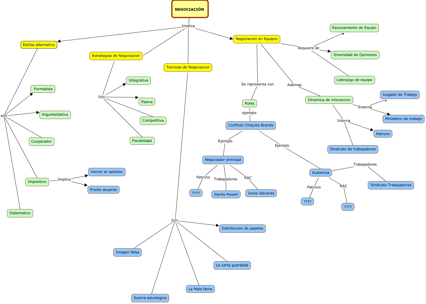 Este Cmap, tiene información relacionada con: Trabajo 04075, Negociador principal Trabajadores Danilo Powell, Negociador principal RAC Irene Valverde, Estilos alternativo son Argumentativo, Tecnicas de Negociacion Son Distribucion de papeles, Tecnicas de Negociacion Son Guerra psicologica, Tecnicas de Negociacion Son La carta guardada, NEGOCIACIÓN Implica Estrategias de Negociacion, Estrategias de Negociacion Son Pasiva, Dinamica de interaccion Interna Patrono, Impositivo Implica Pronto acuerdo, Negociacion en Equipos Requiere de Liderazgo de equipo, Conflicto Chiquita Brands Ejemplo Audiencia, NEGOCIACIÓN Implica Tecnicas de Negociacion, Negociacion en Equipos Requiere de Razonamiento de Equipo, Roles ejemplo Conflicto Chiquita Brands, Conflicto Chiquita Brands Ejemplo Negociador principal, Estilos alternativo son Diplomatico, Dinamica de interaccion Interna Sindicato de trabajadores, Negociacion en Equipos Ademas Dinamica de interaccion, Tecnicas de Negociacion Son Imagen falsa