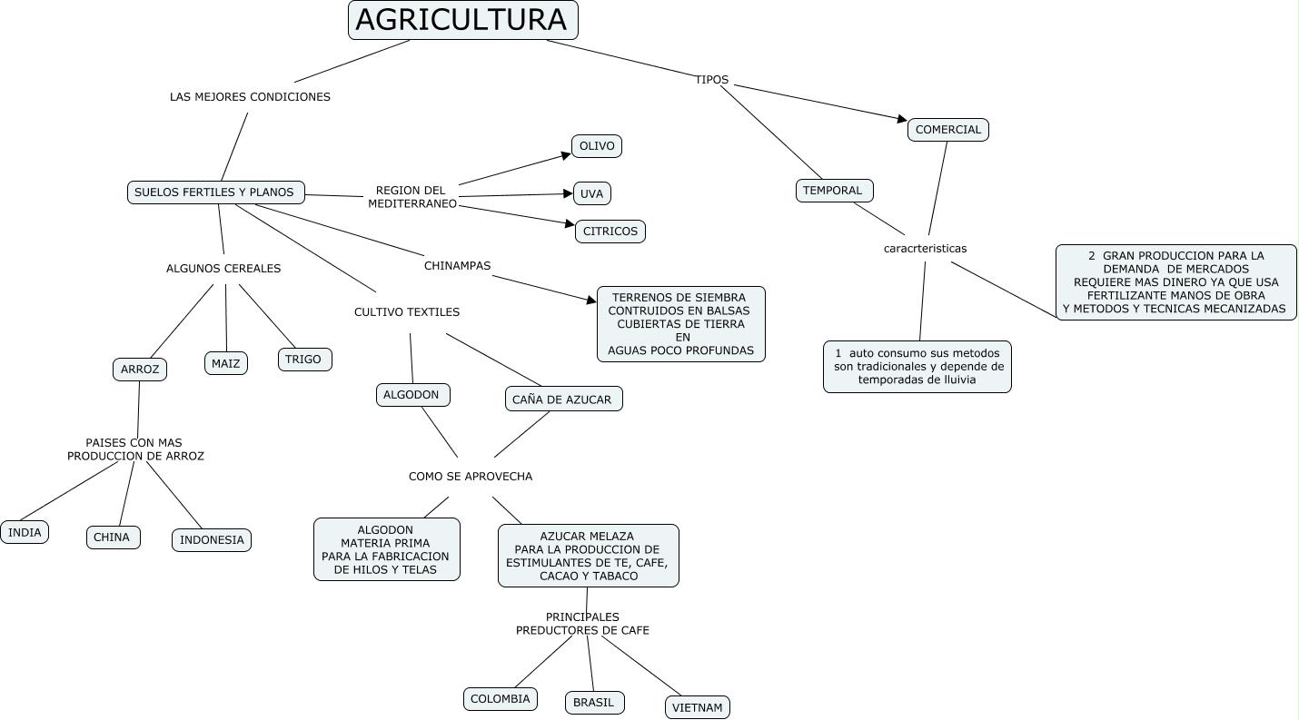 Este Cmap, tiene información relacionada con: agicultura, AZUCAR MELAZA PARA LA PRODUCCION DE ESTIMULANTES DE TE, CAFE, CACAO Y TABACO PRINCIPALES PREDUCTORES DE CAFE BRASIL, AGRICULTURA LAS MEJORES CONDICIONES SUELOS FERTILES Y PLANOS, SUELOS FERTILES Y PLANOS ALGUNOS CEREALES MAIZ, ARROZ PAISES CON MAS PRODUCCION DE ARROZ INDONESIA, AZUCAR MELAZA PARA LA PRODUCCION DE ESTIMULANTES DE TE, CAFE, CACAO Y TABACO PRINCIPALES PREDUCTORES DE CAFE COLOMBIA, CAÑA DE AZUCAR COMO SE APROVECHA AZUCAR MELAZA PARA LA PRODUCCION DE ESTIMULANTES DE TE, CAFE, CACAO Y TABACO, SUELOS FERTILES Y PLANOS REGION DEL MEDITERRANEO CITRICOS, ARROZ PAISES CON MAS PRODUCCION DE ARROZ CHINA, SUELOS FERTILES Y PLANOS REGION DEL MEDITERRANEO OLIVO, AZUCAR MELAZA PARA LA PRODUCCION DE ESTIMULANTES DE TE, CAFE, CACAO Y TABACO PRINCIPALES PREDUCTORES DE CAFE VIETNAM, TEMPORAL caracrteristicas 1 auto consumo sus metodos son tradicionales y depende de temporadas de lluivia, TEMPORAL caracrteristicas 2 GRAN PRODUCCION PARA LA DEMANDA DE MERCADOS REQUIERE MAS DINERO YA QUE USA FERTILIZANTE MANOS DE OBRA Y METODOS Y TECNICAS MECANIZADAS, AGRICULTURA TIPOS TEMPORAL, SUELOS FERTILES Y PLANOS REGION DEL MEDITERRANEO UVA, ARROZ PAISES CON MAS PRODUCCION DE ARROZ INDIA, COMERCIAL caracrteristicas 1 auto consumo sus metodos son tradicionales y depende de temporadas de lluivia, SUELOS FERTILES Y PLANOS CULTIVO TEXTILES CAÑA DE AZUCAR, CAÑA DE AZUCAR COMO SE APROVECHA ALGODON MATERIA PRIMA PARA LA FABRICACION DE HILOS Y TELAS, SUELOS FERTILES Y PLANOS ALGUNOS CEREALES TRIGO, SUELOS FERTILES Y PLANOS CULTIVO TEXTILES ALGODON