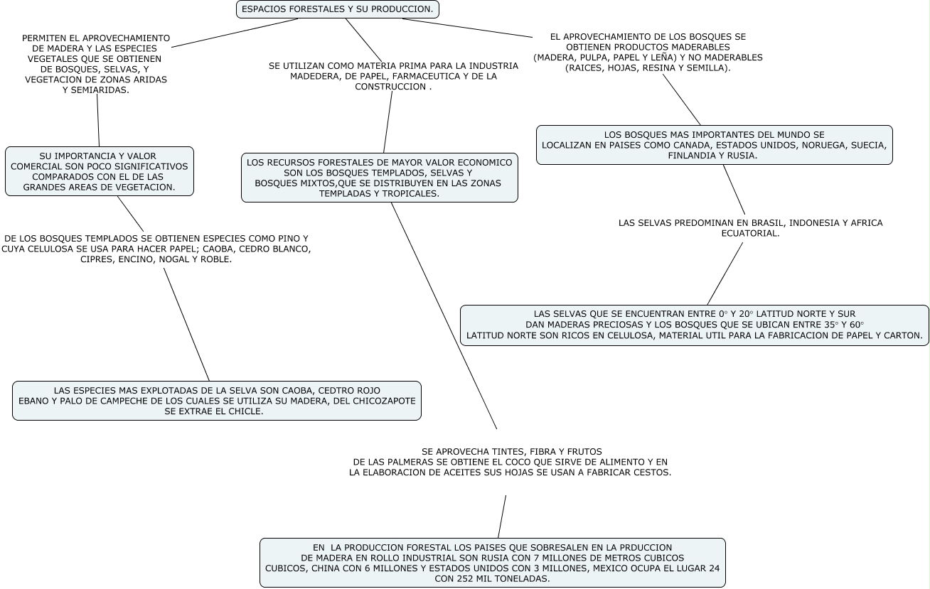 Este Cmap, tiene información relacionada con: ESPACIOS FORESTALES, ESPACIOS FORESTALES Y SU PRODUCCION. EL APROVECHAMIENTO DE LOS BOSQUES SE OBTIENEN PRODUCTOS MADERABLES (MADERA, PULPA, PAPEL Y LEÑA) Y NO MADERABLES (RAICES, HOJAS, RESINA Y SEMILLA). LOS BOSQUES MAS IMPORTANTES DEL MUNDO SE LOCALIZAN EN PAISES COMO CANADA, ESTADOS UNIDOS, NORUEGA, SUECIA, FINLANDIA Y RUSIA., SU IMPORTANCIA Y VALOR COMERCIAL SON POCO SIGNIFICATIVOS COMPARADOS CON EL DE LAS GRANDES AREAS DE VEGETACION. DE LOS BOSQUES TEMPLADOS SE OBTIENEN ESPECIES COMO PINO Y CUYA CELULOSA SE USA PARA HACER PAPEL; CAOBA, CEDRO BLANCO, CIPRES, ENCINO, NOGAL Y ROBLE. LAS ESPECIES MAS EXPLOTADAS DE LA SELVA SON CAOBA, CEDTRO ROJO EBANO Y PALO DE CAMPECHE DE LOS CUALES SE UTILIZA SU MADERA, DEL CHICOZAPOTE SE EXTRAE EL CHICLE., LOS RECURSOS FORESTALES DE MAYOR VALOR ECONOMICO SON LOS BOSQUES TEMPLADOS, SELVAS Y BOSQUES MIXTOS,QUE SE DISTRIBUYEN EN LAS ZONAS TEMPLADAS Y TROPICALES. SE APROVECHA TINTES, FIBRA Y FRUTOS DE LAS PALMERAS SE OBTIENE EL COCO QUE SIRVE DE ALIMENTO Y EN LA ELABORACION DE ACEITES SUS HOJAS SE USAN A FABRICAR CESTOS. EN LA PRODUCCION FORESTAL LOS PAISES QUE SOBRESALEN EN LA PRDUCCION DE MADERA EN ROLLO INDUSTRIAL SON RUSIA CON 7 MILLONES DE METROS CUBICOS CUBICOS, CHINA CON 6 MILLONES Y ESTADOS UNIDOS CON 3 MILLONES, MEXICO OCUPA EL LUGAR 24 CON 252 MIL TONELADAS., ESPACIOS FORESTALES Y SU PRODUCCION. SE UTILIZAN COMO MATERIA PRIMA PARA LA INDUSTRIA MADEDERA, DE PAPEL, FARMACEUTICA Y DE LA CONSTRUCCION . LOS RECURSOS FORESTALES DE MAYOR VALOR ECONOMICO SON LOS BOSQUES TEMPLADOS, SELVAS Y BOSQUES MIXTOS,QUE SE DISTRIBUYEN EN LAS ZONAS TEMPLADAS Y TROPICALES., LOS BOSQUES MAS IMPORTANTES DEL MUNDO SE LOCALIZAN EN PAISES COMO CANADA, ESTADOS UNIDOS, NORUEGA, SUECIA, FINLANDIA Y RUSIA. LAS SELVAS PREDOMINAN EN BRASIL, INDONESIA Y AFRICA ECUATORIAL. LAS SELVAS QUE SE ENCUENTRAN ENTRE 0° Y 20° LATITUD NORTE Y SUR DAN MADERAS PRECIOSAS Y LOS BOSQUES QUE SE UBICAN ENTRE 35° Y 60° LATITUD NORTE SON RICOS EN CELULOSA, MATERIAL UTIL PARA LA FABRICACION DE PAPEL Y CARTON., ESPACIOS FORESTALES Y SU PRODUCCION. PERMITEN EL APROVECHAMIENTO DE MADERA Y LAS ESPECIES VEGETALES QUE SE OBTIENEN DE BOSQUES, SELVAS, Y VEGETACION DE ZONAS ARIDAS Y SEMIARIDAS. SU IMPORTANCIA Y VALOR COMERCIAL SON POCO SIGNIFICATIVOS COMPARADOS CON EL DE LAS GRANDES AREAS DE VEGETACION.