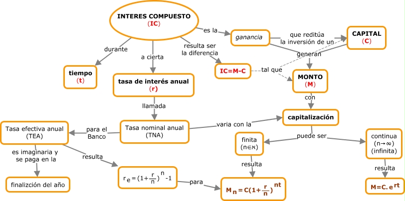 Este Cmap, tiene información relacionada con: INTERES COMPUESTO, ganancia generan MONTO (M), INTERES COMPUESTO (IC) durante tiempo (t), IC=M-C tal que CAPITAL (C), Tasa efectiva anual (TEA) resulta <math xmlns="http://www.w3.org/1998/Math/MathML"> <mmultiscripts> <mtext> r </mtext> <mtext> e </mtext> <none/> </mmultiscripts> <mtext> = </mtext> <mmultiscripts> <mrow> <mtext> (1+ </mtext> <mfrac> <mtext> r </mtext> <mtext> n </mtext> </mfrac> <mtext> ) </mtext> </mrow> <none/> <mtext> n </mtext> </mmultiscripts> <mtext> -1 </mtext> </math>, IC=M-C tal que MONTO (M), INTERES COMPUESTO (IC) es la ganancia, ganancia que reditúa la inversión de un CAPITAL (C), finita (n∈ℵ) resulta <math xmlns="http://www.w3.org/1998/Math/MathML"> <mrow> <mmultiscripts> <mtext> M </mtext> <mtext> n </mtext> <none/> </mmultiscripts> <mtext> = </mtext> <mmultiscripts> <mrow> <mtext> C(1+ </mtext> <mfrac> <mtext> r </mtext> <mtext> n </mtext> </mfrac> <mtext> ) </mtext> </mrow> <none/> <mtext> nt </mtext> </mmultiscripts> </mrow> </math>, <math xmlns="http://www.w3.org/1998/Math/MathML"> <mmultiscripts> <mtext> r </mtext> <mtext> e </mtext> <none/> </mmultiscripts> <mtext> = </mtext> <mmultiscripts> <mrow> <mtext> (1+ </mtext> <mfrac> <mtext> r </mtext> <mtext> n </mtext> </mfrac> <mtext> ) </mtext> </mrow> <none/> <mtext> n </mtext> </mmultiscripts> <mtext> -1 </mtext> </math> para <math xmlns="http://www.w3.org/1998/Math/MathML"> <mrow> <mmultiscripts> <mtext> M </mtext> <mtext> n </mtext> <none/> </mmultiscripts> <mtext> = </mtext> <mmultiscripts> <mrow> <mtext> C(1+ </mtext> <mfrac> <mtext> r </mtext> <mtext> n </mtext> </mfrac> <mtext> ) </mtext> </mrow> <none/> <mtext> nt </mtext> </mmultiscripts> </mrow> </math>, Tasa efectiva anual (TEA) es imaginaria y se paga en la finalizción del año, capitalización puede ser continua (n→∞) (infinita), Tasa nominal anual (TNA) varia con la capitalización, MONTO (M) con capitalización, INTERES COMPUESTO (IC) a cierta tasa de interés anual (r), CAPITAL (C) generan MONTO (M), continua (n→∞) (infinita) resulta <math xmlns="http://www.w3.org/1998/Math/MathML"> <mrow> <mtext> M=C. </mtext> <mmultiscripts> <mtext> e </mtext> <none/> <mtext> rt </mtext> </mmultiscripts> </mrow> </math>, Tasa nominal anual (TNA) para el Banco Tasa efectiva anual (TEA), INTERES COMPUESTO (IC) resulta ser la diferencia IC=M-C, capitalización puede ser finita (n∈ℵ), tasa de interés anual (r) llamada Tasa nominal anual (TNA)