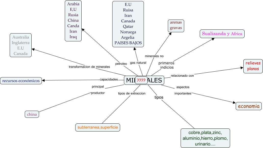 Este Cmap, tiene información relacionada con: mineral, MINERALES capacidades recursos económicos, MINERALES tipos cobre,plata,zinc, aluminio,hierro,plomo, urinario...., MINERALES relacionado con relieves planos, MINERALES transformacion de minerales Australia Inglaterra E.U Canada, MINERALES petroleo Arabia E,U Rusia China Canda Iran Iraq, MINERALES minerales no arenas gravas, MINERALES primeros indicios Sualizanda y Africa, MINERALES tipos de extraccion subterranea,superficie, MINERALES principal productor china, MINERALES gas natural E.U Ruisa Iran Canada Qatar Noruega Argelia PAISES BAJOS, MINERALES aspectos importantes economia