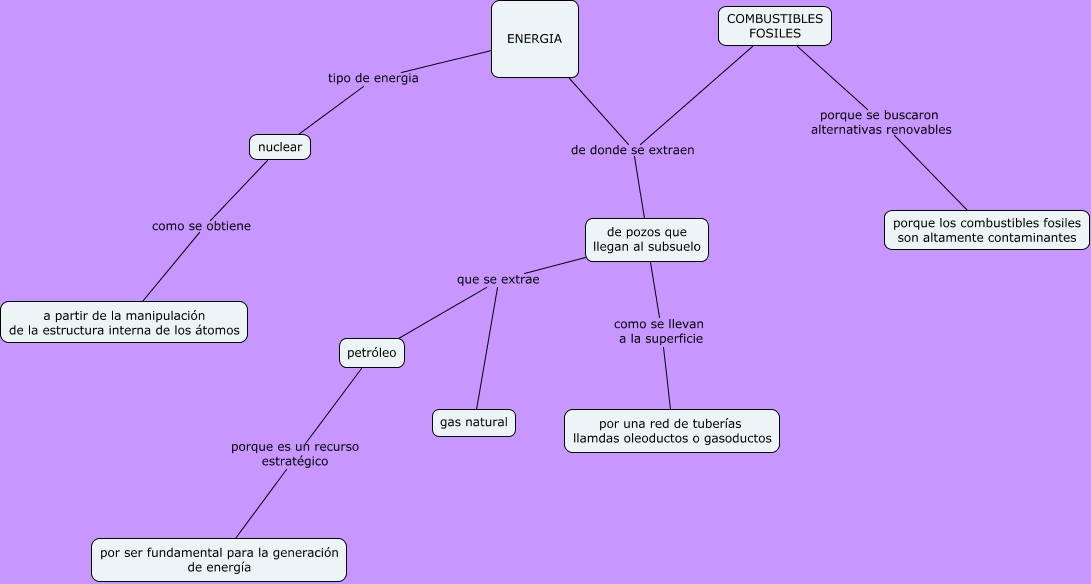 Este Cmap, tiene información relacionada con: energia, ENERGIA de donde se extraen de pozos que llegan al subsuelo, petróleo porque es un recurso estratégico por ser fundamental para la generación de energía, COMBUSTIBLES FOSILES de donde se extraen de pozos que llegan al subsuelo, ENERGIA tipo de energia nuclear, COMBUSTIBLES FOSILES porque se buscaron alternativas renovables porque los combustibles fosiles son altamente contaminantes, de pozos que llegan al subsuelo como se llevan a la superficie por una red de tuberías llamdas oleoductos o gasoductos, nuclear como se obtiene a partir de la manipulación de la estructura interna de los átomos, de pozos que llegan al subsuelo que se extrae gas natural, de pozos que llegan al subsuelo que se extrae petróleo
