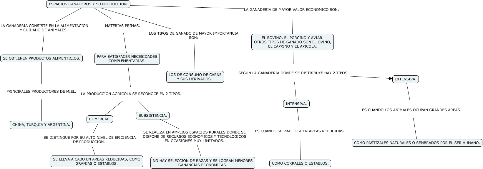 Este Cmap, tiene información relacionada con: GANADERIA, COMERCIAL SE DISTINGUE POR SU ALTO NIVEL DE EFICIENCIA DE PRODUCCION. SE LLEVA A CABO EN AREAS REDUCIDAS, COMO GRANJAS O ESTABLOS., INTENSIVA. ES CUANDO SE PRACTICA EN AREAS REDUCIDAS. COMO CORRALES O ESTABLOS., SE OBTIENEN PRODUCTOS ALIMENTICIOS. PRINCIPALES PRODUCTORES DE MIEL. CHINA, TURQUIA Y ARGENTINA., ESPACIOS GANADEROS Y SU PRODUCCION. MATERIAS PRIMAS. PARA SATISFACER NECESIDADES COMPLEMENTARIAS., PARA SATISFACER NECESIDADES COMPLEMENTARIAS. LA PRODUCCION AGRICOLA SE RECONOCE EN 2 TIPOS. SUBSISTENCIA., ESPACIOS GANADEROS Y SU PRODUCCION. LOS TIPOS DE GANADO DE MAYOR IMPORTANCIA SON: LOS DE CONSUMO DE CARNE Y SUS DERIVADOS., ESPACIOS GANADEROS Y SU PRODUCCION. LA GANADERIA DE MAYOR VALOR ECONOMICO SON: EL BOVINO, EL PORCINO Y AVIAR. OTROS TIPOS DE GANADO SON EL OVINO, EL CAPRINO Y EL APICOLA., SUBSISTENCIA. SE REALIZA EN AMPLIOS ESPACIOS RURALES DONDE SE DISPONE DE RECURSOS ECONOMICOS Y TECNOLOGICOS EN OCASIONES MUY LIMITADOS. NO HAY SELECCION DE RAZAS Y SE LOGRAN MENORES GANANCIAS ECONOMICAS., EL BOVINO, EL PORCINO Y AVIAR. OTROS TIPOS DE GANADO SON EL OVINO, EL CAPRINO Y EL APICOLA. SEGUN LA GANADERIA DONDE SE DISTRIBUYE HAY 2 TIPOS. INTENSIVA., COMERCIAL LA PRODUCCION AGRICOLA SE RECONOCE EN 2 TIPOS. SUBSISTENCIA., EXTENSIVA. ES CUANDO LOS ANIMALES OCUPAN GRANDES AREAS. COMO PASTIZALES NATURALES O SEMBRADOS POR EL SER HUMANO., ESPACIOS GANADEROS Y SU PRODUCCION. LA GANADERIA CONSISTE EN LA ALIMENTACION Y CUIDADO DE ANIMALES. SE OBTIENEN PRODUCTOS ALIMENTICIOS., EL BOVINO, EL PORCINO Y AVIAR. OTROS TIPOS DE GANADO SON EL OVINO, EL CAPRINO Y EL APICOLA. SEGUN LA GANADERIA DONDE SE DISTRIBUYE HAY 2 TIPOS. EXTENSIVA.
