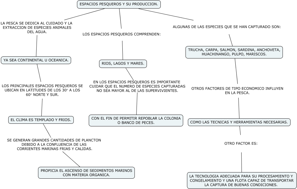 Este Cmap, tiene información relacionada con: ESPACIOS PESQUEROS, YA SEA CONTINENTAL U OCEANICA. LOS PRINCIPALES ESPACIOS PESQUEROS SE UBICAN EN LATITUDES DE LOS 30° A LOS 60° NORTE Y SUR. EL CLIMA ES TEMPLADO Y FRIOS., RIOS, LAGOS Y MARES. EN LOS ESPACIOS PESQUEROS ES IMPORTANTE CUIDAR QUE EL NUMERO DE ESPECIES CAPTURADAS NO SEA MAYOR AL DE LAS SUPERVIVIENTES. CON EL FIN DE PERMITIR REPOBLAR LA COLONIA O BANCO DE PECES., ESPACIOS PESQUEROS Y SU PRODUCCION. ALGUNAS DE LAS ESPECIES QUE SE HAN CAPTURADO SON: TRUCHA, CARPA, SALMON, SARDINA, ANCHOVETA, HUACHINANGO, PULPO, MARISCOS., ESPACIOS PESQUEROS Y SU PRODUCCION. LA PESCA SE DEDICA AL CUIDADO Y LA EXTRACCION DE ESPECIES ANIMALES DEL AGUA. YA SEA CONTINENTAL U OCEANICA., COMO LAS TECNICAS Y HERRAMIENTAS NECESARIAS. OTRO FACTOR ES: LA TECNOLOGIA ADECUADA PARA SU PROCESAMIENTO Y CONGELAMIENTO Y UNA FLOTA CAPAZ DE TRANSPORTAR LA CAPTURA DE BUENAS CONDICIONES., TRUCHA, CARPA, SALMON, SARDINA, ANCHOVETA, HUACHINANGO, PULPO, MARISCOS. OTROS FACTORES DE TIPO ECONOMICO INFLUYEN EN LA PESCA. COMO LAS TECNICAS Y HERRAMIENTAS NECESARIAS., ESPACIOS PESQUEROS Y SU PRODUCCION. LOS ESPACIOS PESQUEROS COMPRENDEN: RIOS, LAGOS Y MARES., EL CLIMA ES TEMPLADO Y FRIOS. SE GENERAN GRANDES CANTIDADES DE PLANCTON DEBIDO A LA CONFLUENCIA DE LAS CORRIENTES MARINAS FRIAS Y CALIDAS. PROPICIA EL ASCENSO DE SEDIMENTOS MARINOS CON MATERIA ORGANICA.