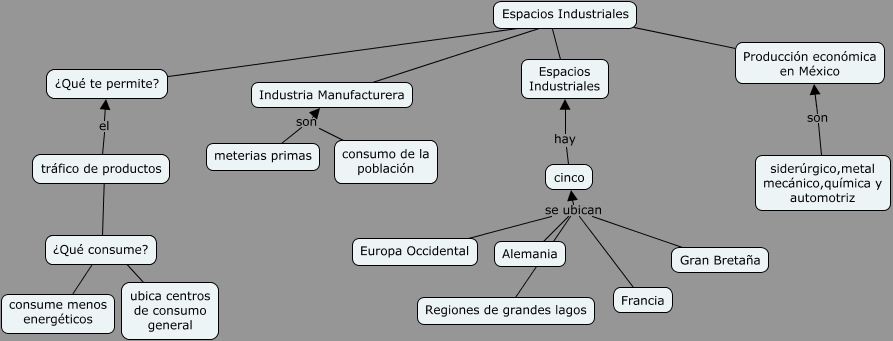 Este Cmap, tiene información relacionada con: Espacios industriales, Europa Occidental se ubican cinco, Industria Manufacturera ???? Espacios Industriales, cinco hay Espacios Industriales, Producción económica en México ???? Espacios Industriales, ¿Qué te permite? ???? Espacios Industriales, Francia se ubican cinco, ubica centros de consumo general ???? ¿Qué consume?, consume menos energéticos bggu ¿Qué consume?, Regiones de grandes lagos se ubican cinco, siderúrgico,metal mecánico,química y automotriz son Producción económica en México, Alemania se ubican cinco, ¿Qué consume? ???? tráfico de productos, tráfico de productos el ¿Qué te permite?, consumo de la población son Industria Manufacturera, Gran Bretaña se ubican cinco, Espacios Industriales ???? Espacios Industriales, meterias primas son Industria Manufacturera