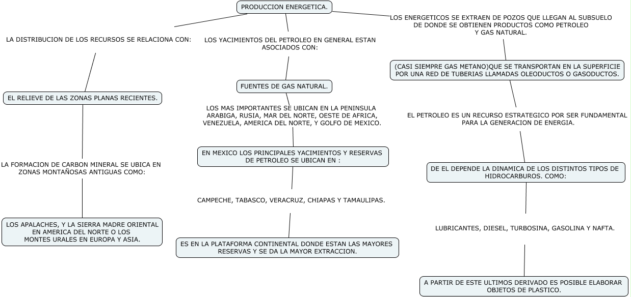 Este Cmap, tiene información relacionada con: PRODUCCION ENERGETICA, FUENTES DE GAS NATURAL. LOS MAS IMPORTANTES SE UBICAN EN LA PENINSULA ARABIGA, RUSIA, MAR DEL NORTE, OESTE DE AFRICA, VENEZUELA, AMERICA DEL NORTE, Y GOLFO DE MEXICO. EN MEXICO LOS PRINCIPALES YACIMIENTOS Y RESERVAS DE PETROLEO SE UBICAN EN :, PRODUCCION ENERGETICA. LOS ENERGETICOS SE EXTRAEN DE POZOS QUE LLEGAN AL SUBSUELO DE DONDE SE OBTIENEN PRODUCTOS COMO PETROLEO Y GAS NATURAL. (CASI SIEMPRE GAS METANO)QUE SE TRANSPORTAN EN LA SUPERFICIE POR UNA RED DE TUBERIAS LLAMADAS OLEODUCTOS O GASODUCTOS., EN MEXICO LOS PRINCIPALES YACIMIENTOS Y RESERVAS DE PETROLEO SE UBICAN EN : CAMPECHE, TABASCO, VERACRUZ, CHIAPAS Y TAMAULIPAS. ES EN LA PLATAFORMA CONTINENTAL DONDE ESTAN LAS MAYORES RESERVAS Y SE DA LA MAYOR EXTRACCION., PRODUCCION ENERGETICA. LOS YACIMIENTOS DEL PETROLEO EN GENERAL ESTAN ASOCIADOS CON: FUENTES DE GAS NATURAL., PRODUCCION ENERGETICA. LA DISTRIBUCION DE LOS RECURSOS SE RELACIONA CON: EL RELIEVE DE LAS ZONAS PLANAS RECIENTES., (CASI SIEMPRE GAS METANO)QUE SE TRANSPORTAN EN LA SUPERFICIE POR UNA RED DE TUBERIAS LLAMADAS OLEODUCTOS O GASODUCTOS. EL PETROLEO ES UN RECURSO ESTRATEGICO POR SER FUNDAMENTAL PARA LA GENERACION DE ENERGIA. DE EL DEPENDE LA DINAMICA DE LOS DISTINTOS TIPOS DE HIDROCARBUROS. COMO:, EL RELIEVE DE LAS ZONAS PLANAS RECIENTES. LA FORMACION DE CARBON MINERAL SE UBICA EN ZONAS MONTAÑOSAS ANTIGUAS COMO: LOS APALACHES, Y LA SIERRA MADRE ORIENTAL EN AMERICA DEL NORTE O LOS MONTES URALES EN EUROPA Y ASIA., DE EL DEPENDE LA DINAMICA DE LOS DISTINTOS TIPOS DE HIDROCARBUROS. COMO: LUBRICANTES, DIESEL, TURBOSINA, GASOLINA Y NAFTA. A PARTIR DE ESTE ULTIMOS DERIVADO ES POSIBLE ELABORAR OBJETOS DE PLASTICO.