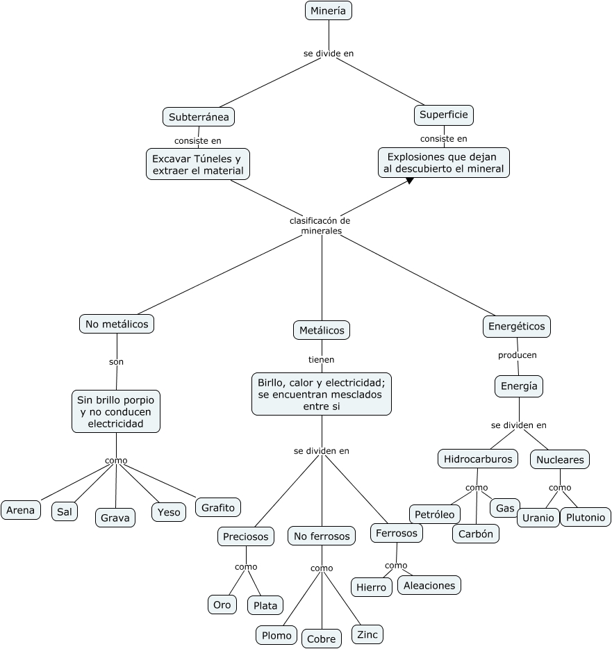Este Cmap, tiene información relacionada con: Minería, Metálicos tienen Birllo, calor y electricidad; se encuentran mesclados entre si, Energía se dividen en Nucleares, Preciosos como Plata, Birllo, calor y electricidad; se encuentran mesclados entre si se dividen en No ferrosos, Subterránea consiste en Excavar Túneles y extraer el material, Sin brillo porpio y no conducen electricidad como Yeso, Minería se divide en Superficie, Excavar Túneles y extraer el material clasificacón de minerales Metálicos, Ferrosos como Hierro, Hidrocarburos como Carbón, Excavar Túneles y extraer el material clasificacón de minerales Energéticos, Hidrocarburos como Gas, No ferrosos como Cobre, Birllo, calor y electricidad; se encuentran mesclados entre si se dividen en Preciosos, Sin brillo porpio y no conducen electricidad como Sal, Nucleares como Plutonio, Nucleares como Uranio, Preciosos como Oro, Energéticos producen Energía, Sin brillo porpio y no conducen electricidad como Grafito