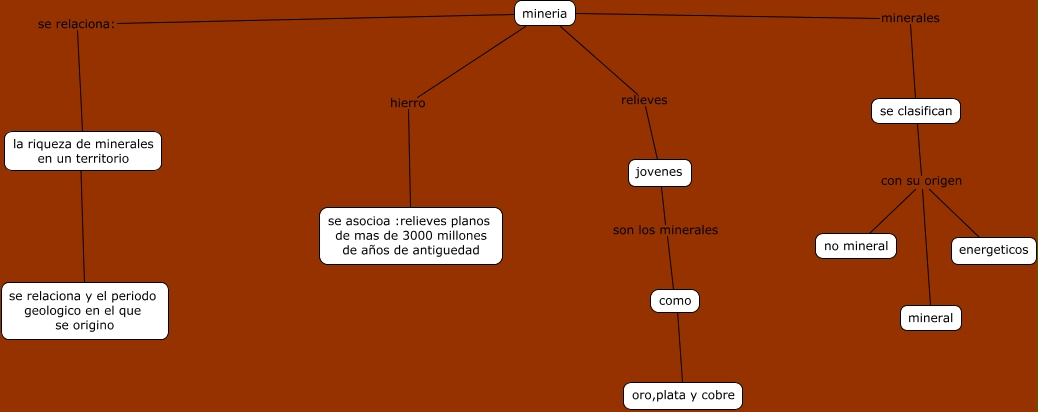 Este Cmap, tiene información relacionada con: mineria, se clasifican con su origen no mineral, mineria minerales se clasifican, mineria se relaciona: la riqueza de minerales en un territorio, como ???? oro,plata y cobre, la riqueza de minerales en un territorio ???? se relaciona y el periodo geologico en el que se origino, se clasifican con su origen mineral, mineria hierro se asocioa :relieves planos de mas de 3000 millones de años de antiguedad, mineria relieves jovenes, se clasifican con su origen energeticos, jovenes son los minerales como
