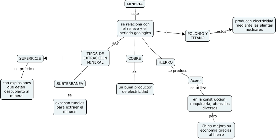 Este Cmap, tiene información relacionada con: MINERIA, POLONIO Y TITANO estos producen electricidad mediante las plantas nucleares, TIPOS DE EXTRACCION MINERAL SUBTERRANEA, MINERIA este se relaciona con el relieve y el periodo geologico, Acero se utiliza en la construccion, maquinaria, utensilios diversos, se relaciona con el relieve y el periodo geologico COBRE, en la construccion, maquinaria, utensilios diversos pero China mejoro su economia gracias al hierro, se relaciona con el relieve y el periodo geologico HAY TIPOS DE EXTRACCION MINERAL, SUPERFICIE se practica con explosiones que dejan descubierto al mineral, COBRE es un buen productor de electricidad, se relaciona con el relieve y el periodo geologico HIERRO, HIERRO se produce Acero, se relaciona con el relieve y el periodo geologico POLONIO Y TITANO, TIPOS DE EXTRACCION MINERAL SUPERFICIE, SUBTERRANEA se excaban tuneles para extraer el mineral