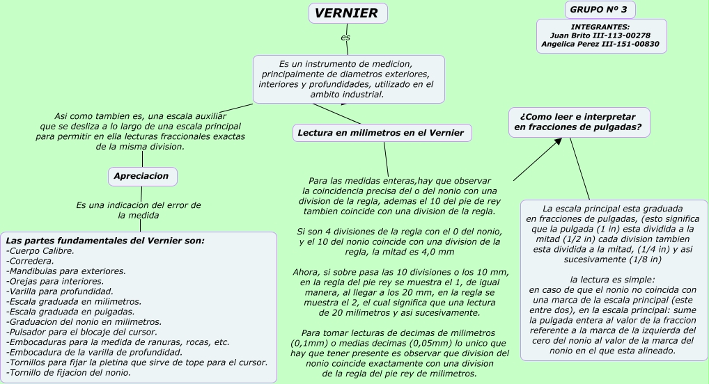 Este Cmap, tiene información relacionada con: Vernier, Es un instrumento de medicion, principalmente de diametros exteriores, interiores y profundidades, utilizado en el ambito industrial. Asi como tambien es, una escala auxiliar que se desliza a lo largo de una escala principal para permitir en ella lecturas fraccionales exactas de la misma division. Apreciacion, Lectura en milimetros en el Vernier Para las medidas enteras,hay que observar la coincidencia precisa del o del nonio con una division de la regla, ademas el 10 del pie de rey tambien coincide con una division de la regla. Si son 4 divisiones de la regla con el 0 del nonio, y el 10 del nonio coincide con una division de la regla, la mitad es 4,0 mm Ahora, si sobre pasa las 10 divisiones o los 10 mm, en la regla del pie rey se muestra el 1, de igual manera, al llegar a los 20 mm, en la regla se muestra el 2, el cual significa que una lectura de 20 milimetros y asi sucesivamente. Para tomar lecturas de decimas de milimetros (0,1mm) o medias decimas (0,05mm) lo unico que hay que tener presente es observar que division del nonio coincide exactamente con una division de la regla del pie rey de milimetros. ¿Como leer e interpretar en fracciones de pulgadas?, VERNIER es Es un instrumento de medicion, principalmente de diametros exteriores, interiores y profundidades, utilizado en el ambito industrial., Apreciacion Es una indicacion del error de la medida Las partes fundamentales del Vernier son: -Cuerpo Calibre. -Corredera. -Mandibulas para exteriores. -Orejas para interiores. -Varilla para profundidad. -Escala graduada en milimetros. -Escala graduada en pulgadas. -Graduacion del nonio en milimetros. -Pulsador para el blocaje del cursor. -Embocaduras para la medida de ranuras, rocas, etc. -Embocadura de la varilla de profundidad. -Tornillos para fijar la pletina que sirve de tope para el cursor. -Tornillo de fijacion del nonio., La escala principal esta graduada en fracciones de pulgadas, (esto significa que la pulgada (1 in) esta dividida a la mitad (1/2 in) cada division tambien esta dividida a la mitad, (1/4 in) y asi sucesivamente (1/8 in) la lectura es simple: en caso de que el nonio no coincida con una marca de la escala principal (este entre dos), en la escala principal: sume la pulgada entera al valor de la fraccion referente a la marca de la izquierda del cero del nonio al valor de la marca del nonio en el que esta alineado. ???? ¿Como leer e interpretar en fracciones de pulgadas?, Lectura en milimetros en el Vernier ???? Es un instrumento de medicion, principalmente de diametros exteriores, interiores y profundidades, utilizado en el ambito industrial.