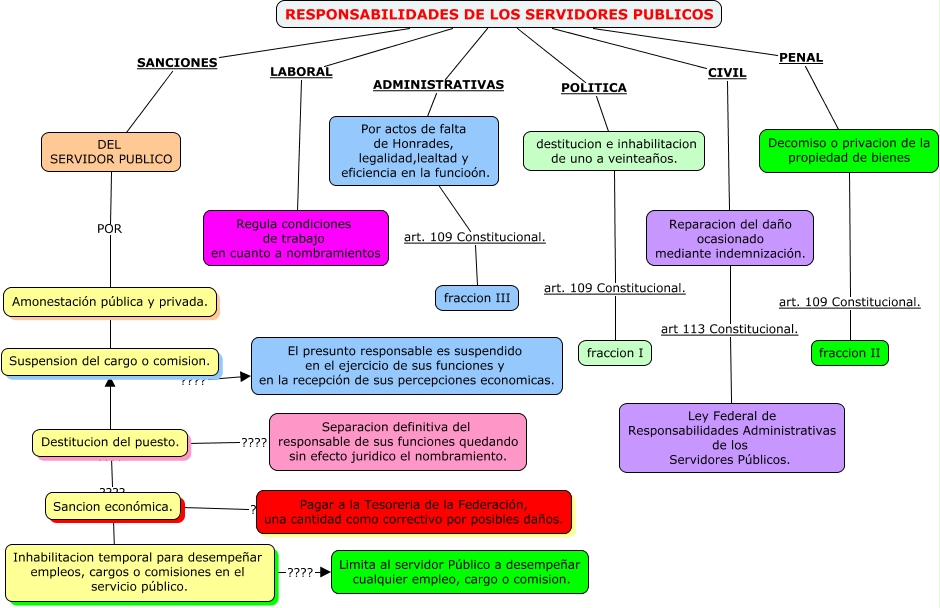 Este Cmap, tiene información relacionada con: SERVIDORES PUBLICOS, DEL SERVIDOR PUBLICO POR Amonestación pública y privada., Destitucion del puesto. ???? Separacion definitiva del responsable de sus funciones quedando sin efecto juridico el nombramiento., RESPONSABILIDADES DE LOS SERVIDORES PUBLICOS ADMINISTRATIVAS Por actos de falta de Honrades, legalidad,lealtad y eficiencia en la funcioón., RESPONSABILIDADES DE LOS SERVIDORES PUBLICOS SANCIONES DEL SERVIDOR PUBLICO, Reparacion del daño ocasionado mediante indemnización. art 113 Constitucional. Ley Federal de Responsabilidades Administrativas de los Servidores Públicos., RESPONSABILIDADES DE LOS SERVIDORES PUBLICOS POLITICA destitucion e inhabilitacion de uno a veinteaños., Inhabilitacion temporal para desempeñar empleos, cargos o comisiones en el servicio público. ???? Limita al servidor Público a desempeñar cualquier empleo, cargo o comision., Destitucion del puesto. ???? Sancion económica., destitucion e inhabilitacion de uno a veinteaños. art. 109 Constitucional. fraccion I, Decomiso o privacion de la propiedad de bienes art. 109 Constitucional. fraccion II, RESPONSABILIDADES DE LOS SERVIDORES PUBLICOS PENAL Decomiso o privacion de la propiedad de bienes, Amonestación pública y privada. ???? Suspension del cargo o comision., Suspension del cargo o comision. ???? El presunto responsable es suspendido en el ejercicio de sus funciones y en la recepción de sus percepciones economicas., Por actos de falta de Honrades, legalidad,lealtad y eficiencia en la funcioón. art. 109 Constitucional. fraccion III, RESPONSABILIDADES DE LOS SERVIDORES PUBLICOS LABORAL Regula condiciones de trabajo en cuanto a nombramientos, Sancion económica. ???? Inhabilitacion temporal para desempeñar empleos, cargos o comisiones en el servicio público., Sancion económica. ???? Pagar a la Tesoreria de la Federación, una cantidad como correctivo por posibles daños., RESPONSABILIDADES DE LOS SERVIDORES PUBLICOS CIVIL Reparacion del daño ocasionado mediante indemnización.