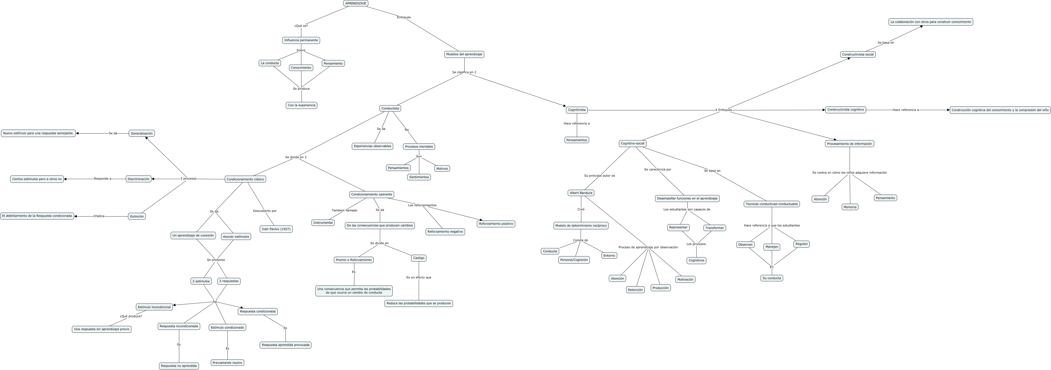 Este Cmap, tiene información relacionada con: Aprendizaje, Pensamiento Se produce Con la experiencia, APRENDIZAJE ¿Qué es? Influencia permanente, 2 estímulos Así Estímulo condicionado, Condicionamiento operante Tambien llamado Instrumental, Condicionamiento clásico 3 procesos Generalización, Modelo de determinismo recíproco Consta de Entorno, Albert Bandura Proceso de aprendizaje por observación Atención, Procesos mentales Son Sentimientos, Influencia permanente Sobre La conducta, Constructivista social Se basa en La colaboración con otros para construir conocimiento, Premio o Reforzamiento Es Una consecuencia que permita las probabilidades de que ocurra un cambio de conducta, APRENDIZAJE Enfoques Modelos del aprendizaje, Procesos mentales Son Pensamientos, Estímulo condicionado Es Previamente neutro, Modelo de determinismo recíproco Consta de Conducta, Regulen En Su conducta, Procesos mentales Son Motivos, 2 respuestas Así Estímulo incondicional, Observen En Su conducta, Influencia permanente Sobre Pensamiento
