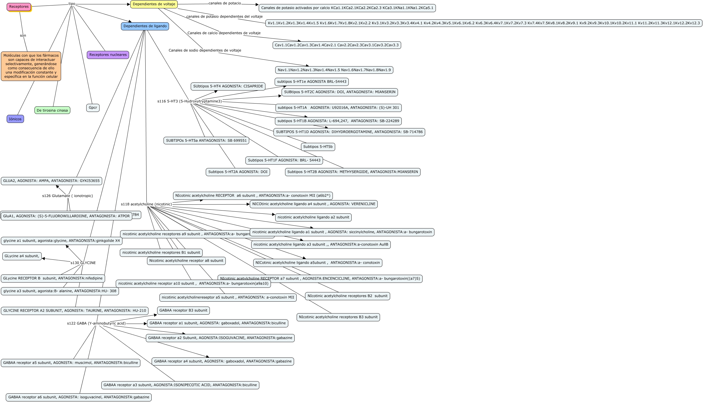 Este Cmap, tiene información relacionada con: Receptores, Dependientes de ligando s118 acetylcholine (nicotinic) NICotinic acetylcholine ligando a5ubunit , ANTAGONISTA:a- conotoxin, Dependientes de ligando s116 5-HT3 (5-Hydroxytryptamine3) SUbtipos 5-HT4 AGONISTA: CISAPRIDE, Dependientes de ligando s116 5-HT3 (5-Hydroxytryptamine3) SUBtipos 5-HT2C AGONISTA: DOI, ANTAGONISTA: MIANSERIN, Dependientes de voltaje canales de potacio Canales de potasio activados por calcio KCa1.1 KCa2.1 KCa2.2 KCa2.3 KCa3.1 KNa1.1 KNa1.2 KCa5.1, Dependientes de ligando s122 GABA (Y-aminobutyric acid) GABAA receptor a6 subunit, AGONISTA: isoguvacinel, ANATAGONISTA:gabazine, Dependientes de ligando s116 5-HT3 (5-Hydroxytryptamine3) Subtipos 5-HT2A AGONISTA: DOI, subtipos 5-HT1A AGONISTA: U92016A, ANTAGONISTA: (S)-UH 301 s116 5-HT3 (5-Hydroxytryptamine3) Subtipos 5-HT2B AGONISTA: METHYSERGIDE, ANTAGONISTA:MIANSERIN, subtipos 5-HT1A AGONISTA: U92016A, ANTAGONISTA: (S)-UH 301 s116 5-HT3 (5-Hydroxytryptamine3) Subtipos 5-HT2A AGONISTA: DOI, Dependientes de ligando s118 acetylcholine (nicotinic) NIcotinic acetylcholine receptores B3 subunit, Dependientes de ligando s118 acetylcholine (nicotinic) NICOtinic acetylcholine ligando a4 subunit , AGONISTA: VERENICLINE, Dependientes de ligando s116 5-HT3 (5-Hydroxytryptamine3) Subtipos 5-HT1F AGONISTA: BRL- 54443, subtipos 5-HT1A AGONISTA: U92016A, ANTAGONISTA: (S)-UH 301 s116 5-HT3 (5-Hydroxytryptamine3) SUBTIPOS 5-HT1D AGONISTA: DIHYDROERGOTAMINE, ANTAGONISTA: SB-714786, Dependientes de voltaje Canales de sodio dependientes de voltaje Nav1.1 Nav1.2 Nav1.3 Nav1.4 Nav1.5 Nav1.6 Nav1.7 Nav1.8 Nav1.9, Receptores tipo Gpcr, Dependientes de ligando s130 GLYCINE glycine a1 subunit, agonista:glycine, ANTAGONISTA:ginkgolide X4, Dependientes de ligando s118 acetylcholine (nicotinic) nicotinic acetylcholine ligando a1 subunit , AGONISTA: siccinylcholine, ANTAGONISTA:a- bungarotoxin, Dependientes de ligando s122 GABA (Y-aminobutyric acid) GABAA receptor a1 subunit, AGONISTA: gaboxadol, ANATAGONISTA:biculline, Dependientes de ligando s118 acetylcholine (nicotinic) NIcotinic acetylcholine RECEPTOR a7 subunit , AGONISTA:ENCENCICLINE, ANTAGONISTA:a- bungarotoxin((a7)5), Receptores son Moléculas con que los fármacos son capaces de interactuar selectivamente, generándose como consecuencia de ello una modificación constante y específica en la función celular, subtipos 5-HT1A AGONISTA: U92016A, ANTAGONISTA: (S)-UH 301 s116 5-HT3 (5-Hydroxytryptamine3) SUBTIPOs 5-HT5a ANTAGONISTA: SB 699551