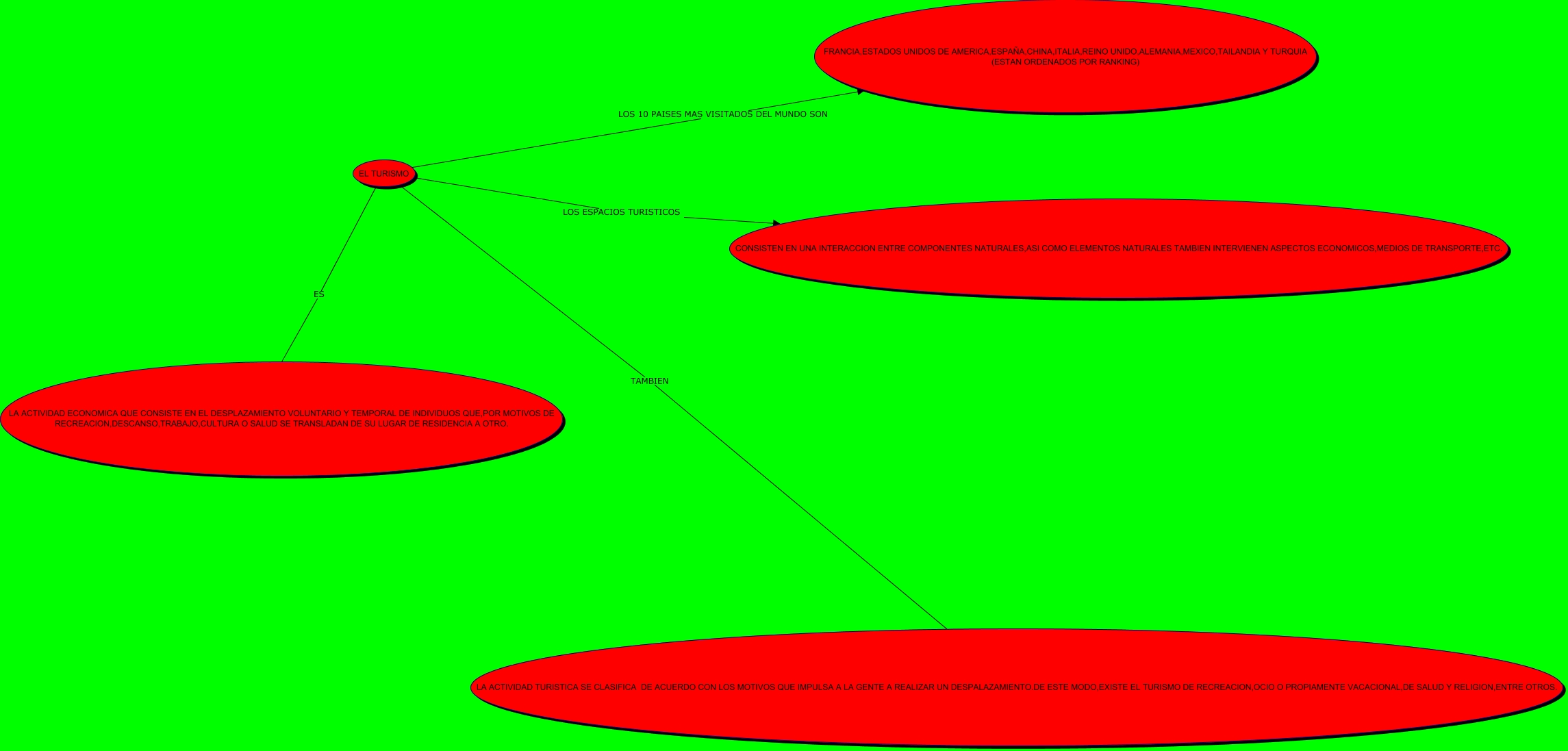 Este Cmap, tiene información relacionada con: TURISMO, EL TURISMO TAMBIEN LA ACTIVIDAD TURISTICA SE CLASIFICA DE ACUERDO CON LOS MOTIVOS QUE IMPULSA A LA GENTE A REALIZAR UN DESPALAZAMIENTO.DE ESTE MODO,EXISTE EL TURISMO DE RECREACION,OCIO O PROPIAMENTE VACACIONAL,DE SALUD Y RELIGION,ENTRE OTROS., EL TURISMO LOS ESPACIOS TURISTICOS CONSISTEN EN UNA INTERACCION ENTRE COMPONENTES NATURALES,ASI COMO ELEMENTOS NATURALES TAMBIEN INTERVIENEN ASPECTOS ECONOMICOS,MEDIOS DE TRANSPORTE,ETC., EL TURISMO ES LA ACTIVIDAD ECONOMICA QUE CONSISTE EN EL DESPLAZAMIENTO VOLUNTARIO Y TEMPORAL DE INDIVIDUOS QUE,POR MOTIVOS DE RECREACION,DESCANSO,TRABAJO,CULTURA O SALUD SE TRANSLADAN DE SU LUGAR DE RESIDENCIA A OTRO., EL TURISMO LOS 10 PAISES MAS VISITADOS DEL MUNDO SON FRANCIA,ESTADOS UNIDOS DE AMERICA,ESPAÑA,CHINA,ITALIA,REINO UNIDO,ALEMANIA,MEXICO,TAILANDIA Y TURQUIA (ESTAN ORDENADOS POR RANKING)
