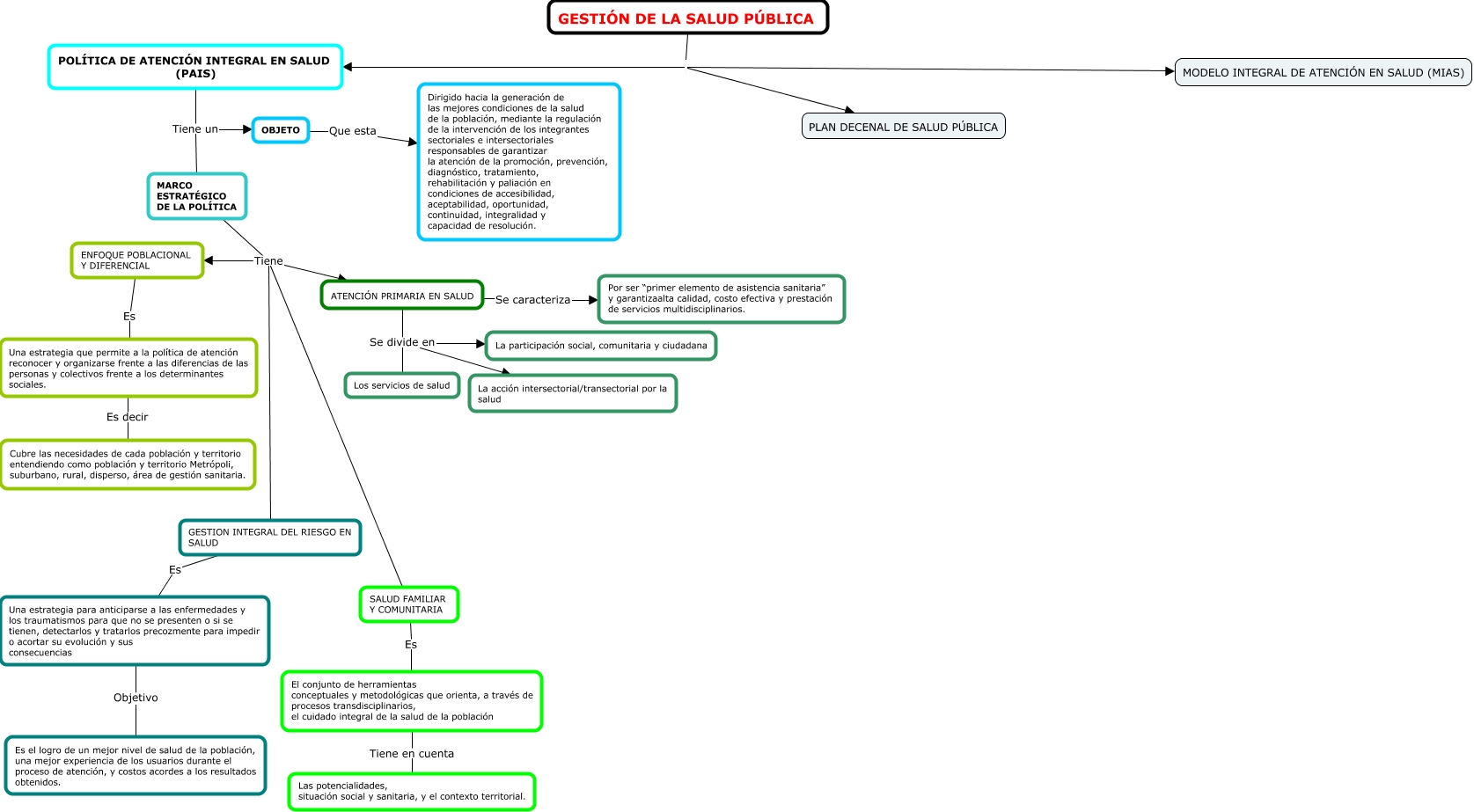 Este Cmap, tiene información relacionada con: GESTIÓN DE LA SALUD PÚBLICA, GESTIÓN DE LA SALUD PÚBLICA MODELO INTEGRAL DE ATENCIÓN EN SALUD (MIAS), GESTION INTEGRAL DEL RIESGO EN SALUD Es Una estrategia para anticiparse a las enfermedades y los traumatismos para que no se presenten o si se tienen, detectarlos y tratarlos precozmente para impedir o acortar su evolución y sus consecuencias, ATENCIÓN PRIMARIA EN SALUD Se divide en Los servicios de salud, MARCO ESTRATÉGICO DE LA POLÍTICA Tiene GESTION INTEGRAL DEL RIESGO EN SALUD, ATENCIÓN PRIMARIA EN SALUD Se caracteriza Por ser “primer elemento de asistencia sanitaria” y garantizaalta calidad, costo efectiva y prestación de servicios multidisciplinarios., GESTIÓN DE LA SALUD PÚBLICA PLAN DECENAL DE SALUD PÚBLICA, ATENCIÓN PRIMARIA EN SALUD Se divide en La participación social, comunitaria y ciudadana, OBJETO Que esta Dirigido hacia la generación de las mejores condiciones de la salud de la población, mediante la regulación de la intervención de los integrantes sectoriales e intersectoriales responsables de garantizar la atención de la promoción, prevención, diagnóstico, tratamiento, rehabilitación y paliación en condiciones de accesibilidad, aceptabilidad, oportunidad, continuidad, integralidad y capacidad de resolución., ENFOQUE POBLACIONAL Y DIFERENCIAL Es Una estrategia que permite a la política de atención reconocer y organizarse frente a las diferencias de las personas y colectivos frente a los determinantes sociales., POLÍTICA DE ATENCIÓN INTEGRAL EN SALUD (PAIS) Tiene un OBJETO, ATENCIÓN PRIMARIA EN SALUD Se divide en La acción intersectorial/transectorial por la salud, SALUD FAMILIAR Y COMUNITARIA Es El conjunto de herramientas conceptuales y metodológicas que orienta, a través de procesos transdisciplinarios, el cuidado integral de la salud de la población, GESTIÓN DE LA SALUD PÚBLICA POLÍTICA DE ATENCIÓN INTEGRAL EN SALUD (PAIS), MARCO ESTRATÉGICO DE LA POLÍTICA Tiene ENFOQUE POBLACIONAL Y DIFERENCIAL, Una estrategia para anticiparse a las enfermedades y los traumatismos para que no se presenten o si se tienen, detectarlos y tratarlos precozmente para impedir o acortar su evolución y sus consecuencias Objetivo Es el logro de un mejor nivel de salud de la población, una mejor experiencia de los usuarios durante el proceso de atención, y costos acordes a los resultados obtenidos., MARCO ESTRATÉGICO DE LA POLÍTICA Tiene SALUD FAMILIAR Y COMUNITARIA, Una estrategia que permite a la política de atención reconocer y organizarse frente a las diferencias de las personas y colectivos frente a los determinantes sociales. Es decir Cubre las necesidades de cada población y territorio entendiendo como población y territorio Metrópoli, suburbano, rural, disperso, área de gestión sanitaria., MARCO ESTRATÉGICO DE LA POLÍTICA Tiene ATENCIÓN PRIMARIA EN SALUD, POLÍTICA DE ATENCIÓN INTEGRAL EN SALUD (PAIS) Tiene un MARCO ESTRATÉGICO DE LA POLÍTICA, El conjunto de herramientas conceptuales y metodológicas que orienta, a través de procesos transdisciplinarios, el cuidado integral de la salud de la población Tiene en cuenta Las potencialidades, situación social y sanitaria, y el contexto territorial.