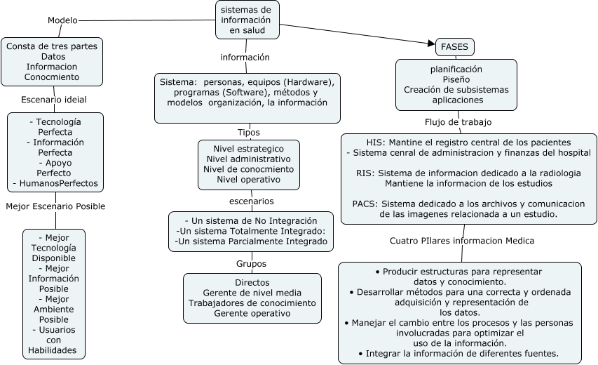 Este Cmap, tiene información relacionada con: 5555, FASES ???? planificación Piseño Creación de subsistemas aplicaciones, HIS: Mantine el registro central de los pacientes - Sistema cenral de administracion y finanzas del hospital RIS: Sistema de informacion dedicado a la radiologia Mantiene la informacion de los estudios PACS: Sistema dedicado a los archivos y comunicacion de las imagenes relacionada a un estudio. Cuatro PIlares informacion Medica • Producir estructuras para representar datos y conocimiento. • Desarrollar métodos para una correcta y ordenada adquisición y representación de los datos. • Manejar el cambio entre los procesos y las personas involucradas para optimizar el uso de la información. • Integrar la información de diferentes fuentes., Consta de tres partes Datos Informacion Conocmiento Escenario ideial - Tecnología Perfecta - Información Perfecta - Apoyo Perfecto - HumanosPerfectos, Sistema: personas, equipos (Hardware), programas (Software), métodos y modelos organización, la información Tipos Nivel estrategico Nivel administrativo Nivel de conocmiento Nivel operativo, sistemas de información en salud ???? FASES, - Tecnología Perfecta - Información Perfecta - Apoyo Perfecto - HumanosPerfectos Mejor Escenario Posible - Mejor Tecnología Disponible - Mejor Información Posible - Mejor Ambiente Posible - Usuarios con Habilidades, sistemas de información en salud Modelo Consta de tres partes Datos Informacion Conocmiento, Nivel estrategico Nivel administrativo Nivel de conocmiento Nivel operativo escenarios - Un sistema de No Integración -Un sistema Totalmente Integrado: -Un sistema Parcialmente Integrado, sistemas de información en salud información Sistema: personas, equipos (Hardware), programas (Software), métodos y modelos organización, la información, - Un sistema de No Integración -Un sistema Totalmente Integrado: -Un sistema Parcialmente Integrado Grupos Directos Gerente de nivel media Trabajadores de conocimiento Gerente operativo, planificación Piseño Creación de subsistemas aplicaciones Flujo de trabajo HIS: Mantine el registro central de los pacientes - Sistema cenral de administracion y finanzas del hospital RIS: Sistema de informacion dedicado a la radiologia Mantiene la informacion de los estudios PACS: Sistema dedicado a los archivos y comunicacion de las imagenes relacionada a un estudio.