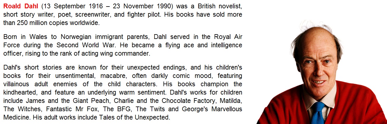 Biginning.jpg Conflict.jpg Middle.jpg Place.jpg Primary characters.jpg Resolution.jpg Roald Dahl.jpg Secondary Characters.jpg Theme.jpg Time.jpg