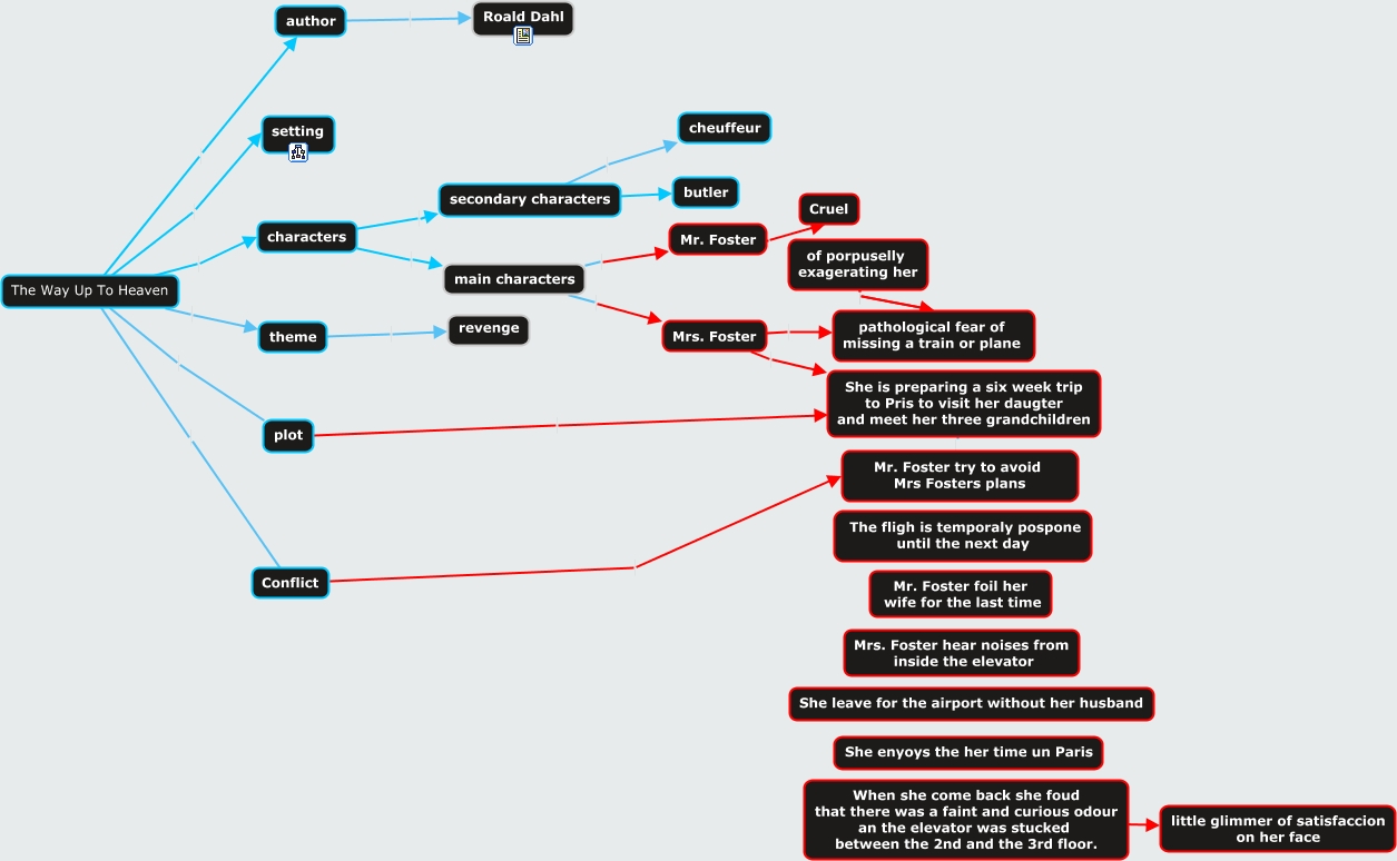 Este Cmap, tiene información relacionada con: THE WAY UP TO HEAVEN, She is preparing a six week trip to Pris to visit her daugter and meet her three grandchildren Mr. Foster try to avoid Mrs Fosters plans, secondary characters cheuffeur, author Roald Dahl, plot ????, The Way Up To Heaven plot, The Way Up To Heaven setting, of porpuselly exagerating her pathological fear of missing a train or plane, The Way Up To Heaven author, When she come back she foud that there was a faint and curious odour an the elevator was stucked between the 2nd and the 3rd floor. ???? little glimmer of satisfaccion on her face, main characters Mrs. Foster, theme revenge, main characters Mr. Foster, Mrs. Foster She is preparing a six week trip to Pris to visit her daugter and meet her three grandchildren, secondary characters ???? butler, Mr. Foster Cruel, The Way Up To Heaven characters, of porpuselly exagerating her pathological fear of missing a train or plane, Conflict Mr. Foster try to avoid Mrs Fosters plans, characters secondary characters, characters main characters
