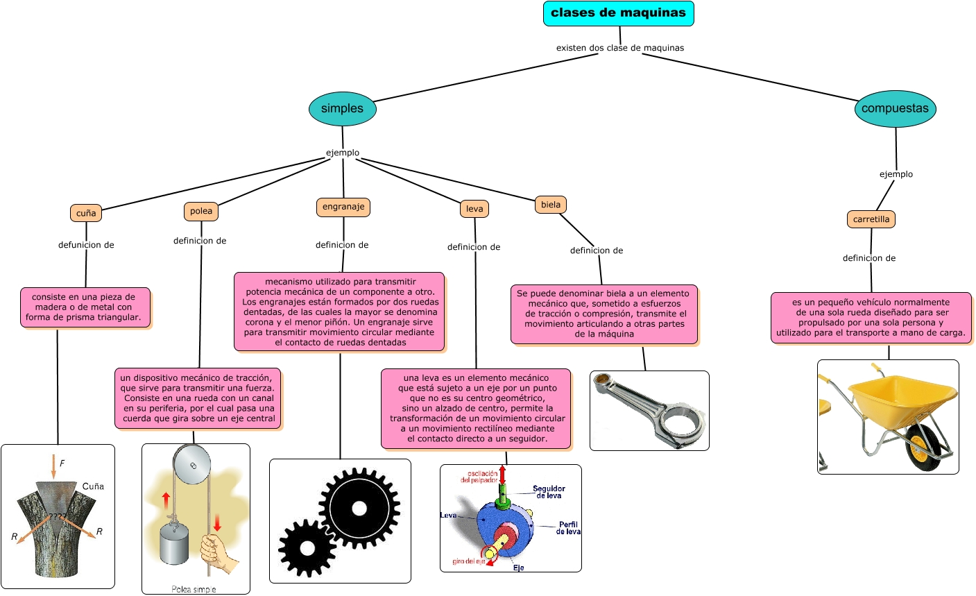 Este Cmap, tiene información relacionada con: Julian abril ciclo 502, simples ejemplo cuña, clases de maquinas existen dos clase de maquinas simples, clases de maquinas existen dos clase de maquinas compuestas, simples ejemplo engranaje, simples ejemplo biela, simples ejemplo polea, polea definicion de un dispositivo mecánico de tracción, que sirve para transmitir una fuerza. Consiste en una rueda con un canal en su periferia, por el cual pasa una cuerda que gira sobre un eje central, un dispositivo mecánico de tracción, que sirve para transmitir una fuerza. Consiste en una rueda con un canal en su periferia, por el cual pasa una cuerda que gira sobre un eje central ????, mecanismo utilizado para transmitir potencia mecánica de un componente a otro. Los engranajes están formados por dos ruedas dentadas, de las cuales la mayor se denomina corona y el menor piñón. Un engranaje sirve para transmitir movimiento circular mediante el contacto de ruedas dentadas ????, compuestas ejemplo carretilla, carretilla definicion de es un pequeño vehículo normalmente de una sola rueda diseñado para ser propulsado por una sola persona y utilizado para el transporte a mano de carga., leva definicion de una leva es un elemento mecánico que está sujeto a un eje por un punto que no es su centro geométrico, sino un alzado de centro, permite la transformación de un movimiento circular a un movimiento rectilíneo mediante el contacto directo a un seguidor., ???? es un pequeño vehículo normalmente de una sola rueda diseñado para ser propulsado por una sola persona y utilizado para el transporte a mano de carga., engranaje definicion de mecanismo utilizado para transmitir potencia mecánica de un componente a otro. Los engranajes están formados por dos ruedas dentadas, de las cuales la mayor se denomina corona y el menor piñón. Un engranaje sirve para transmitir movimiento circular mediante el contacto de ruedas dentadas, simples ejemplo leva, una leva es un elemento mecánico que está sujeto a un eje por un punto que no es su centro geométrico, sino un alzado de centro, permite la transformación de un movimiento circular a un movimiento rectilíneo mediante el contacto directo a un seguidor. ????, biela definicion de Se puede denominar biela a un elemento mecánico que, sometido a esfuerzos de tracción o compresión, transmite el movimiento articulando a otras partes de la máquina, cuña defunicion de consiste en una pieza de madera o de metal con forma de prisma triangular., consiste en una pieza de madera o de metal con forma de prisma triangular. ???? ????, Se puede denominar biela a un elemento mecánico que, sometido a esfuerzos de tracción o compresión, transmite el movimiento articulando a otras partes de la máquina ????
