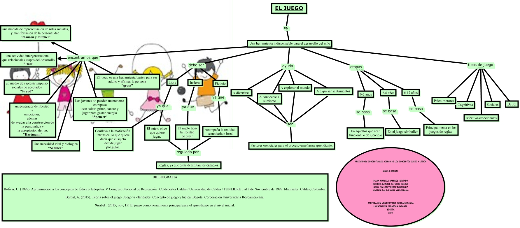 Este Cmap, tiene información relacionada con: EL JUEGO, Una herramienta indispensable para el desarrollo del niño encontramos que una medida de representacion de roles sociales, y manifestacion de la personalidad. "manson y mitchel", Una herramienta indispensable para el desarrollo del niño etapas 2-6 años, Insierto ya que El sujeto tiene la libertad de crear., A expresar sentimientos son Factores esenciales para el proceso enseñanza aprendizaje., Una herramienta indispensable para el desarrollo del niño tipos de juego Cognitivos, Una herramienta indispensable para el desarrollo del niño debe ser Ficticio, Libre ya que Conlleva a la motivación intrinsica, lo que quiere decir que el sujeto decide jugar por jugar., Una herramienta indispensable para el desarrollo del niño ayuda A explorar el mundo, Una herramienta indispensable para el desarrollo del niño debe ser Insierto, 6-12 años se basa Principalmente en los juegos de reglas, A divertirse son Factores esenciales para el proceso enseñanza aprendizaje., Una herramienta indispensable para el desarrollo del niño tipos de juego Sociales, A conocerse a si mismo son Factores esenciales para el proceso enseñanza aprendizaje., Una herramienta indispensable para el desarrollo del niño etapas 0-2 años, Una herramienta indispensable para el desarrollo del niño encontramos que una actividad intergeneracional, que relacionalas etapas del desarrollo "Hall", Libre ya que El sujeto elige que quiere jugar., Acompaña la realidad secundaria o irreal regulado por Reglas, ya que estas delimitan los espacios., Una herramienta indispensable para el desarrollo del niño etapas 6-12 años, Una herramienta indispensable para el desarrollo del niño encontramos que Una necesidad vital y biologica "Schiller", Una herramienta indispensable para el desarrollo del niño debe ser Libre