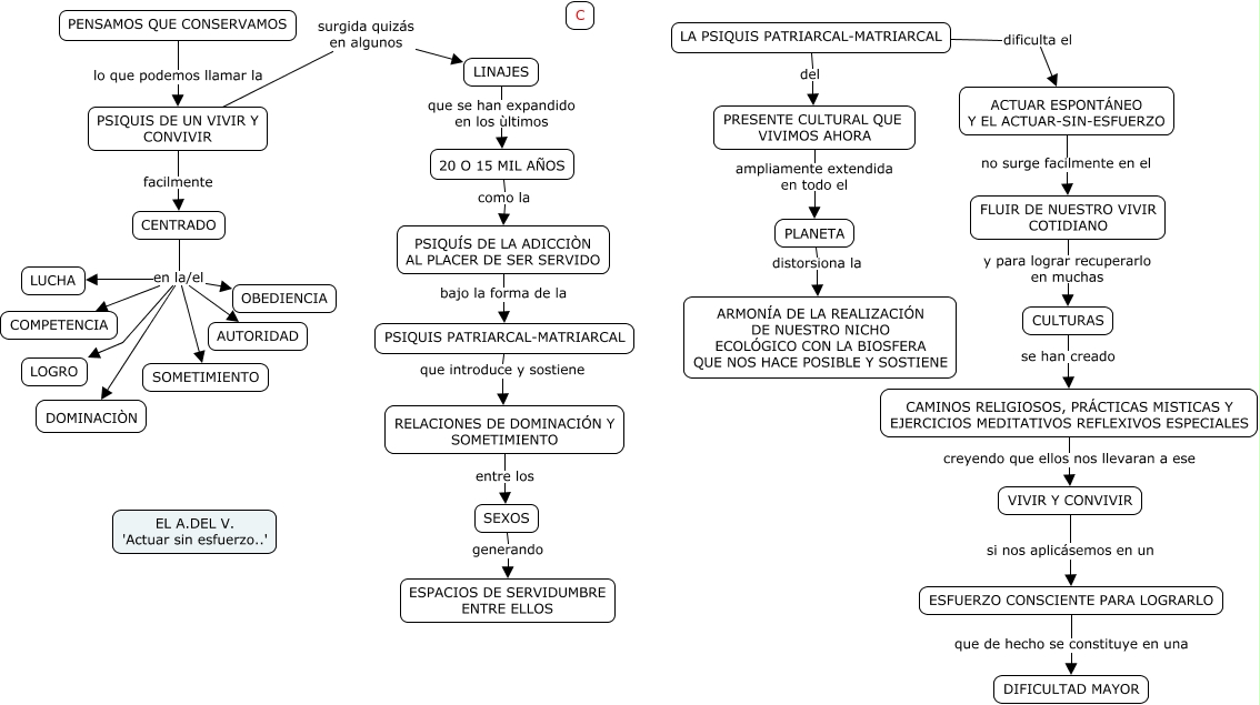 Este Cmap, tiene información relacionada con: Surgimiento de la PSIQUÍS PATRIARCAL-MATRIARCAL, CENTRADO en la/el LOGRO, RELACIONES DE DOMINACIÓN Y SOMETIMIENTO entre los SEXOS, CENTRADO en la/el AUTORIDAD, CENTRADO en la/el COMPETENCIA, ESFUERZO CONSCIENTE PARA LOGRARLO que de hecho se constituye en una DIFICULTAD MAYOR, CENTRADO en la/el LUCHA, LA PSIQUIS PATRIARCAL-MATRIARCAL del PRESENTE CULTURAL QUE VIVIMOS AHORA, SEXOS generando ESPACIOS DE SERVIDUMBRE ENTRE ELLOS, FLUIR DE NUESTRO VIVIR COTIDIANO y para lograr recuperarlo en muchas CULTURAS, LA PSIQUIS PATRIARCAL-MATRIARCAL dificulta el ACTUAR ESPONTÁNEO Y EL ACTUAR-SIN-ESFUERZO, PLANETA distorsiona la ARMONÍA DE LA REALIZACIÓN DE NUESTRO NICHO ECOLÓGICO CON LA BIOSFERA QUE NOS HACE POSIBLE Y SOSTIENE, PRESENTE CULTURAL QUE VIVIMOS AHORA ampliamente extendida en todo el PLANETA, PSIQUÍS DE LA ADICCIÒN AL PLACER DE SER SERVIDO bajo la forma de la PSIQUIS PATRIARCAL-MATRIARCAL, CAMINOS RELIGIOSOS, PRÁCTICAS MISTICAS Y EJERCICIOS MEDITATIVOS REFLEXIVOS ESPECIALES creyendo que ellos nos llevaran a ese VIVIR Y CONVIVIR, CENTRADO en la/el OBEDIENCIA, CENTRADO en la/el DOMINACIÒN, PSIQUIS DE UN VIVIR Y CONVIVIR surgida quizás en algunos LINAJES, VIVIR Y CONVIVIR si nos aplicásemos en un ESFUERZO CONSCIENTE PARA LOGRARLO, PSIQUIS DE UN VIVIR Y CONVIVIR facilmente CENTRADO, ACTUAR ESPONTÁNEO Y EL ACTUAR-SIN-ESFUERZO no surge facilmente en el FLUIR DE NUESTRO VIVIR COTIDIANO