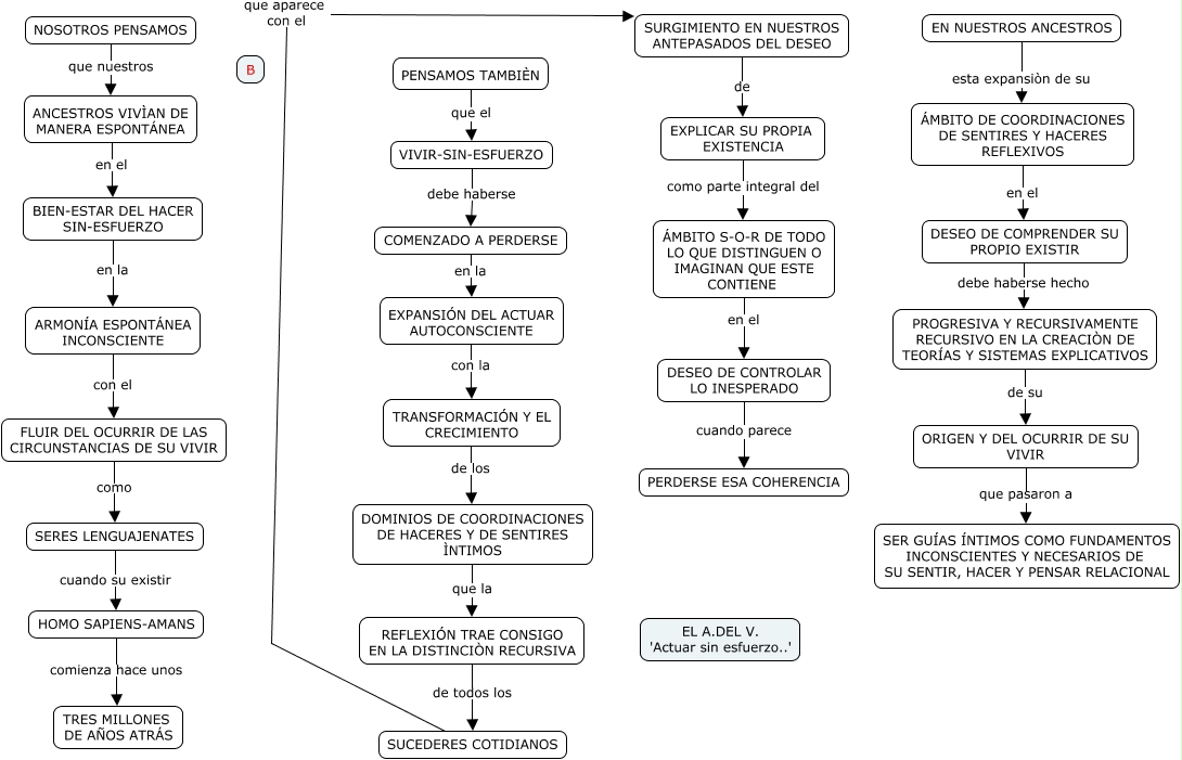 Este Cmap, tiene información relacionada con: El vivir sin esfuerzo de nuestros ancestros, SURGIMIENTO EN NUESTROS ANTEPASADOS DEL DESEO de EXPLICAR SU PROPIA EXISTENCIA, FLUIR DEL OCURRIR DE LAS CIRCUNSTANCIAS DE SU VIVIR como SERES LENGUAJENATES, ORIGEN Y DEL OCURRIR DE SU VIVIR que pasaron a SER GUÍAS ÍNTIMOS COMO FUNDAMENTOS INCONSCIENTES Y NECESARIOS DE SU SENTIR, HACER Y PENSAR RELACIONAL, ARMONÍA ESPONTÁNEA INCONSCIENTE con el FLUIR DEL OCURRIR DE LAS CIRCUNSTANCIAS DE SU VIVIR, ÁMBITO S-O-R DE TODO LO QUE DISTINGUEN O IMAGINAN QUE ESTE CONTIENE en el DESEO DE CONTROLAR LO INESPERADO, COMENZADO A PERDERSE en la EXPANSIÓN DEL ACTUAR AUTOCONSCIENTE, HOMO SAPIENS-AMANS comienza hace unos TRES MILLONES DE AÑOS ATRÁS, ANCESTROS VIVÌAN DE MANERA ESPONTÁNEA en el BIEN-ESTAR DEL HACER SIN-ESFUERZO, DOMINIOS DE COORDINACIONES DE HACERES Y DE SENTIRES ÌNTIMOS que la REFLEXIÓN TRAE CONSIGO EN LA DISTINCIÒN RECURSIVA, BIEN-ESTAR DEL HACER SIN-ESFUERZO en la ARMONÍA ESPONTÁNEA INCONSCIENTE, EXPLICAR SU PROPIA EXISTENCIA como parte integral del ÁMBITO S-O-R DE TODO LO QUE DISTINGUEN O IMAGINAN QUE ESTE CONTIENE, TRANSFORMACIÓN Y EL CRECIMIENTO de los DOMINIOS DE COORDINACIONES DE HACERES Y DE SENTIRES ÌNTIMOS, EN NUESTROS ANCESTROS esta expansiòn de su ÁMBITO DE COORDINACIONES DE SENTIRES Y HACERES REFLEXIVOS, DESEO DE CONTROLAR LO INESPERADO cuando parece PERDERSE ESA COHERENCIA, PROGRESIVA Y RECURSIVAMENTE RECURSIVO EN LA CREACIÒN DE TEORÍAS Y SISTEMAS EXPLICATIVOS de su ORIGEN Y DEL OCURRIR DE SU VIVIR, SUCEDERES COTIDIANOS que aparece con el SURGIMIENTO EN NUESTROS ANTEPASADOS DEL DESEO, REFLEXIÓN TRAE CONSIGO EN LA DISTINCIÒN RECURSIVA de todos los SUCEDERES COTIDIANOS, NOSOTROS PENSAMOS que nuestros ANCESTROS VIVÌAN DE MANERA ESPONTÁNEA, VIVIR-SIN-ESFUERZO debe haberse COMENZADO A PERDERSE, SERES LENGUAJENATES cuando su existir HOMO SAPIENS-AMANS