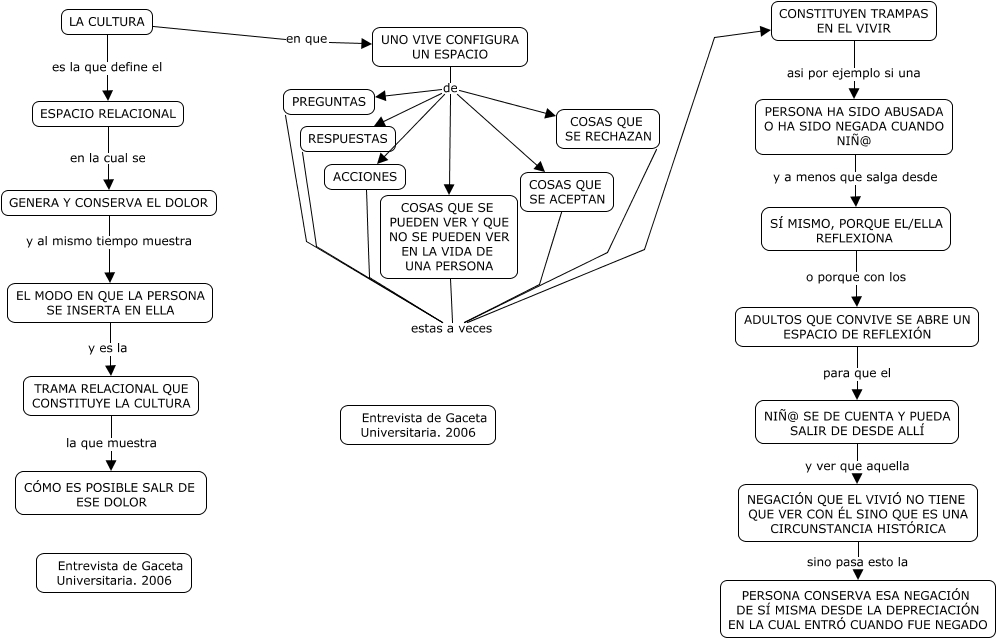 Este Cmap, tiene información relacionada con: La cultura y sus trampas, UNO VIVE CONFIGURA UN ESPACIO de COSAS QUE SE ACEPTAN, COSAS QUE SE RECHAZAN estas a veces CONSTITUYEN TRAMPAS EN EL VIVIR, LA CULTURA en que UNO VIVE CONFIGURA UN ESPACIO, UNO VIVE CONFIGURA UN ESPACIO de COSAS QUE SE RECHAZAN, ESPACIO RELACIONAL en la cual se GENERA Y CONSERVA EL DOLOR, CONSTITUYEN TRAMPAS EN EL VIVIR asi por ejemplo si una PERSONA HA SIDO ABUSADA O HA SIDO NEGADA CUANDO NIÑ@, UNO VIVE CONFIGURA UN ESPACIO de ACCIONES, COSAS QUE SE ACEPTAN estas a veces CONSTITUYEN TRAMPAS EN EL VIVIR, NIÑ@ SE DE CUENTA Y PUEDA SALIR DE DESDE ALLÍ y ver que aquella NEGACIÓN QUE EL VIVIÓ NO TIENE QUE VER CON ÉL SINO QUE ES UNA CIRCUNSTANCIA HISTÓRICA, PERSONA HA SIDO ABUSADA O HA SIDO NEGADA CUANDO NIÑ@ y a menos que salga desde SÍ MISMO, PORQUE EL/ELLA REFLEXIONA, GENERA Y CONSERVA EL DOLOR y al mismo tiempo muestra EL MODO EN QUE LA PERSONA SE INSERTA EN ELLA, UNO VIVE CONFIGURA UN ESPACIO de RESPUESTAS, EL MODO EN QUE LA PERSONA SE INSERTA EN ELLA y es la TRAMA RELACIONAL QUE CONSTITUYE LA CULTURA, COSAS QUE SE PUEDEN VER Y QUE NO SE PUEDEN VER EN LA VIDA DE UNA PERSONA estas a veces CONSTITUYEN TRAMPAS EN EL VIVIR, LA CULTURA es la que define el ESPACIO RELACIONAL, ACCIONES estas a veces CONSTITUYEN TRAMPAS EN EL VIVIR, UNO VIVE CONFIGURA UN ESPACIO de COSAS QUE SE PUEDEN VER Y QUE NO SE PUEDEN VER EN LA VIDA DE UNA PERSONA, PREGUNTAS estas a veces CONSTITUYEN TRAMPAS EN EL VIVIR, NEGACIÓN QUE EL VIVIÓ NO TIENE QUE VER CON ÉL SINO QUE ES UNA CIRCUNSTANCIA HISTÓRICA sino pasa esto la PERSONA CONSERVA ESA NEGACIÓN DE SÍ MISMA DESDE LA DEPRECIACIÓN EN LA CUAL ENTRÓ CUANDO FUE NEGADO, SÍ MISMO, PORQUE EL/ELLA REFLEXIONA o porque con los ADULTOS QUE CONVIVE SE ABRE UN ESPACIO DE REFLEXIÓN