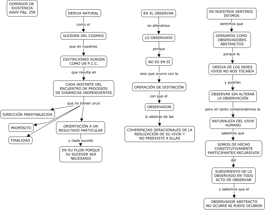 Este Cmap, tiene información relacionada con: El Observador abstracto no existe, OPERACIÓN DE DISTINCIÓN con que el OBSERVADOR, OPERAMOS COMO OBSERVADORES ABSTRACTOS porque la DERIVA DE LOS SERES VIVOS NO NOS TOCARÍA, LO OBSERVADO porque NO ES EN SÍ, DERIVA NATURAL como el SUCEDER DEL COSMOS, NATURALEZA DEL VIVIR HUMANO sabemos que SOMOS DE HECHO CONSTITUTIVAMENTE PARTICIPANTES RECURSIVOS, SOMOS DE HECHO CONSTITUTIVAMENTE PARTICIPANTES RECURSIVOS del SURGIMIENTO DE LO OBSERVADO EN TODO ACTO DE OBSERVAR, ORIENTACIÓN A UN RESULTADO PARTICULAR y nada sucede EN SU FLUIR PORQUE SU SUCEDER SEA NECESARIO, EN EL OBSERVAR no alteramos LO OBSERVADO, EN NUESTROS SENTIRES ÍNTIMOS sentimos que OPERAMOS COMO OBSERVADORES ABSTRACTOS, CADA INSTANTE DEL ENCUENTRO DE PROCESOS DE DINÁMICAS INDPENDIENTES que no tienen un/a PROPÓSITO, OBSERVAR SIN ALTERAR LA OBSERVACIÓN pero en tanto comprendemos la NATURALEZA DEL VIVIR HUMANO, SUCEDER DEL COSMOS que en nuestras DISTINCIONES SURGEN COMO UN P.C.C., NO ES EN SÍ sino que ocurre con la OPERACIÓN DE DISTINCIÓN, DERIVA DE LOS SERES VIVOS NO NOS TOCARÍA y podrían OBSERVAR SIN ALTERAR LA OBSERVACIÓN, DISTINCIONES SURGEN COMO UN P.C.C. que resulta en CADA INSTANTE DEL ENCUENTRO DE PROCESOS DE DINÁMICAS INDPENDIENTES, CADA INSTANTE DEL ENCUENTRO DE PROCESOS DE DINÁMICAS INDPENDIENTES que no tienen un/a FINALIDAD, OBSERVADOR lo abstrae de las COHERENCIAS OERACIONALES DE LA REALIZACIÓN DE SU VIVIR Y NO PREEXISTE A ELLAS, CADA INSTANTE DEL ENCUENTRO DE PROCESOS DE DINÁMICAS INDPENDIENTES que no tienen un/a ORIENTACIÓN A UN RESULTADO PARTICULAR, SURGIMIENTO DE LO OBSERVADO EN TODO ACTO DE OBSERVAR y sabemos que el OBSERVADOR ABSTRACTO NO OCURRE NI PUEDE OCURRIR, CADA INSTANTE DEL ENCUENTRO DE PROCESOS DE DINÁMICAS INDPENDIENTES que no tienen un/a DIRECCIÓN PRESTABLECIDA