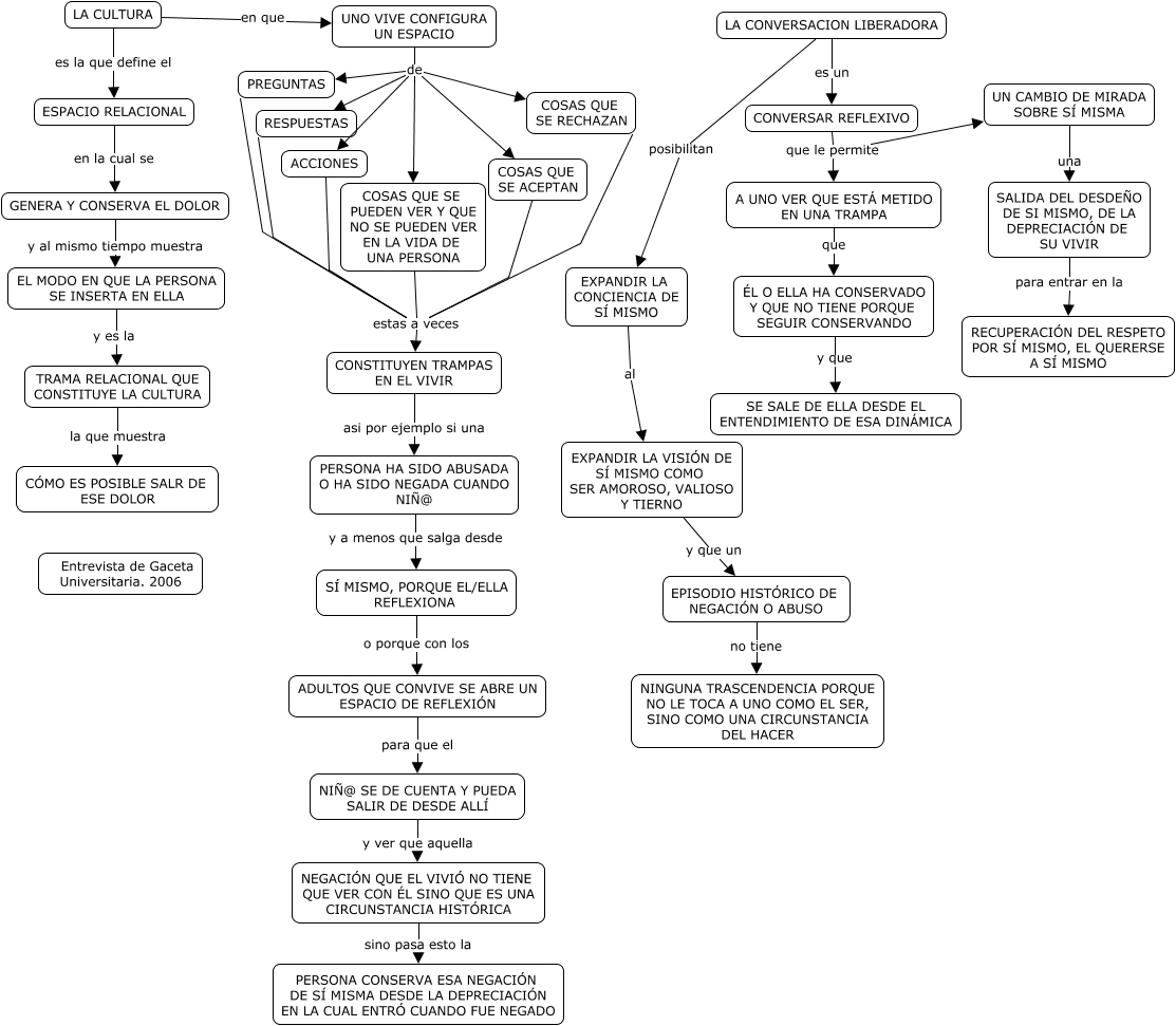 Este Cmap, tiene información relacionada con: EL DOLOR Y EL SUFRIMIENTO ES DE ORIGEN CULTURAL, ACCIONES estas a veces CONSTITUYEN TRAMPAS EN EL VIVIR, UNO VIVE CONFIGURA UN ESPACIO de RESPUESTAS, TRAMA RELACIONAL QUE CONSTITUYE LA CULTURA la que muestra CÓMO ES POSIBLE SALR DE ESE DOLOR, CONVERSAR REFLEXIVO que le permite A UNO VER QUE ESTÁ METIDO EN UNA TRAMPA, COSAS QUE SE RECHAZAN estas a veces CONSTITUYEN TRAMPAS EN EL VIVIR, COSAS QUE SE ACEPTAN estas a veces CONSTITUYEN TRAMPAS EN EL VIVIR, EPISODIO HISTÓRICO DE NEGACIÓN O ABUSO no tiene NINGUNA TRASCENDENCIA PORQUE NO LE TOCA A UNO COMO EL SER, SINO COMO UNA CIRCUNSTANCIA DEL HACER, ESPACIO RELACIONAL en la cual se GENERA Y CONSERVA EL DOLOR, GENERA Y CONSERVA EL DOLOR y al mismo tiempo muestra EL MODO EN QUE LA PERSONA SE INSERTA EN ELLA, UNO VIVE CONFIGURA UN ESPACIO de ACCIONES, A UNO VER QUE ESTÁ METIDO EN UNA TRAMPA que ÉL O ELLA HA CONSERVADO Y QUE NO TIENE PORQUE SEGUIR CONSERVANDO, LA CULTURA es la que define el ESPACIO RELACIONAL, NIÑ@ SE DE CUENTA Y PUEDA SALIR DE DESDE ALLÍ y ver que aquella NEGACIÓN QUE EL VIVIÓ NO TIENE QUE VER CON ÉL SINO QUE ES UNA CIRCUNSTANCIA HISTÓRICA, EXPANDIR LA CONCIENCIA DE SÍ MISMO al EXPANDIR LA VISIÓN DE SÍ MISMO COMO SER AMOROSO, VALIOSO Y TIERNO, LA CONVERSACION LIBERADORA posibilitan EXPANDIR LA CONCIENCIA DE SÍ MISMO, SALIDA DEL DESDEÑO DE SI MISMO, DE LA DEPRECIACIÓN DE SU VIVIR para entrar en la RECUPERACIÓN DEL RESPETO POR SÍ MISMO, EL QUERERSE A SÍ MISMO, RESPUESTAS estas a veces CONSTITUYEN TRAMPAS EN EL VIVIR, UN CAMBIO DE MIRADA SOBRE SÍ MISMA una SALIDA DEL DESDEÑO DE SI MISMO, DE LA DEPRECIACIÓN DE SU VIVIR, CONSTITUYEN TRAMPAS EN EL VIVIR asi por ejemplo si una PERSONA HA SIDO ABUSADA O HA SIDO NEGADA CUANDO NIÑ@, PERSONA HA SIDO ABUSADA O HA SIDO NEGADA CUANDO NIÑ@ y a menos que salga desde SÍ MISMO, PORQUE EL/ELLA REFLEXIONA