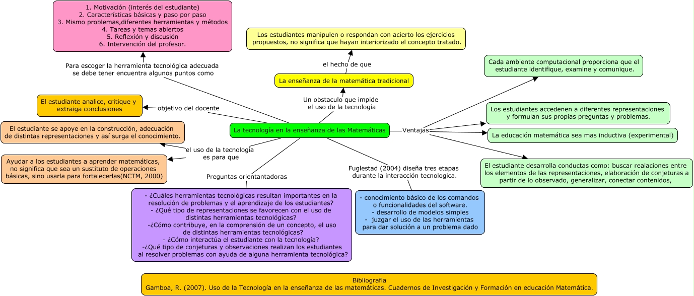 Este Cmap, tiene información relacionada con: MCPM 3, La tecnología en la enseñanza de las Matemáticas el uso de la tecnología es para que El estudiante se apoye en la construcción, adecuación de distintas representaciones y así surga el conocimiento., La tecnología en la enseñanza de las Matemáticas Un obstaculo que impide el uso de la tecnología La enseñanza de la matemática tradicional, La tecnología en la enseñanza de las Matemáticas Ventajas Cada ambiente computacional proporciona que el estudiante identifique, examine y comunique., La enseñanza de la matemática tradicional el hecho de que Los estudiantes manipulen o respondan con acierto los ejercicios propuestos, no significa que hayan interiorizado el concepto tratado., La tecnología en la enseñanza de las Matemáticas Ventajas La educación matemática sea mas inductiva (experimental), La tecnología en la enseñanza de las Matemáticas Para escoger la herramienta tecnológica adecuada se debe tener encuentra algunos puntos como 1. Motivación (interés del estudiante) 2. Características básicas y paso por paso 3. Mismo problemas,diferentes herramientas y métodos 4. Tareas y temas abiertos 5. Reflexión y discusión 6. Intervención del profesor., La tecnología en la enseñanza de las Matemáticas Preguntas orientantadoras - ¿Cuáles herramientas tecnológicas resultan importantes en la resolución de problemas y el aprendizaje de los estudiantes? - ¿Qué tipo de representaciones se favorecen con el uso de distintas herramientas tecnológicas? -¿Cómo contribuye, en la comprensión de un concepto, el uso de distintas herramientas tecnológicas? - ¿Cómo interactúa el estudiante con la tecnología? -¿Qué tipo de conjeturas y observaciones realizan los estudiantes al resolver problemas con ayuda de alguna herramienta tecnológica?, La tecnología en la enseñanza de las Matemáticas el uso de la tecnología es para que Ayudar a los estudiantes a aprender matemáticas, no significa que sea un sustituto de operaciones básicas, sino usarla para fortalecerlas(NCTM, 2000), La tecnología en la enseñanza de las Matemáticas objetivo del docente El estudiante analice, critique y extraiga conclusiones, La tecnología en la enseñanza de las Matemáticas Ventajas Los estudiantes accedenen a diferentes representaciones y formulan sus propias preguntas y problemas., La tecnología en la enseñanza de las Matemáticas Fuglestad (2004) diseña tres etapas durante la interacción tecnologica. - conocimiento básico de los comandos o funcionalidades del software. - desarrollo de modelos simples - juzgar el uso de las herramientas para dar solución a un problema dado, La tecnología en la enseñanza de las Matemáticas Ventajas El estudiante desarrolla conductas como: buscar realaciones entre los elementos de las representaciones, elaboración de conjeturas a partir de lo observado, generalizar, conectar contenidos,
