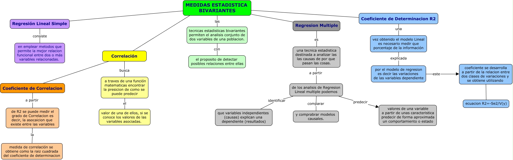 Este Cmap, tiene información relacionada con: Actividad4Estadistica, MEDIDAS ESTADISTICA BIVARIANTES Regresión Lineal Simple, a traves de una función matematicas encontrar la presicion de como se puede predecir el valor de una de ellos, si se conoce los valores de las variables asociadas., Correlación busca a traves de una función matematicas encontrar la presicion de como se puede predecir, de R2 se puede medir el grado de Correlacion es decir, la asocaicion que existe entre las variables la medida de correlación se obtiene como la raiz cuadrada del coeficiente de determinacion, MEDIDAS ESTADISTICA BIVARIANTES Correlación, Correlación Coeficiente de Correlacion, MEDIDAS ESTADISTICA BIVARIANTES las tecnicas estadisticas bivariantes permiten el analisis conjunto de dos variables de una poblacion., MEDIDAS ESTADISTICA BIVARIANTES Regresion Multiple, Regresion Multiple es una tecnica estadistica destinada a analizar las las causas de por que pasan las cosas., de los analisis de Regresion Lineal multiple podemos comparar y comprabrar modelos causales., MEDIDAS ESTADISTICA BIVARIANTES Coeficiente de Determinacion R2, de los analisis de Regresion Lineal multiple podemos predecir valores de una variable a partir de unas caracteristica predecir de forma aproximada un comportamiento o estado, una tecnica estadistica destinada a analizar las las causas de por que pasan las cosas. a partir de los analisis de Regresion Lineal multiple podemos, tecnicas estadisticas bivariantes permiten el analisis conjunto de dos variables de una poblacion. con el proposito de detectar posibles relaciones entre ellas, de los analisis de Regresion Lineal multiple podemos identificar que variables independientes (causas) explican una dependiente (resultados), por el modelo de regresion es decir las variaciones de las variables dependiente este coeficiente se desarrolla a partir de la relacion entre dos clases de variaciones y se obtiene utilizando, Coeficiente de Determinacion R2 una vez obtenido el modelo Lineal es necesario medir que porcentaje de la información, Regresión Lineal Simple consiste en emplear metodos que permite la mejor relacion funcional entre dos o más variables relacionadas., coeficiente se desarrolla a partir de la relacion entre dos clases de variaciones y se obtiene utilizando ecuacion R2=-Se2/V(y), Coeficiente de Correlacion a partir de R2 se puede medir el grado de Correlacion es decir, la asocaicion que existe entre las variables