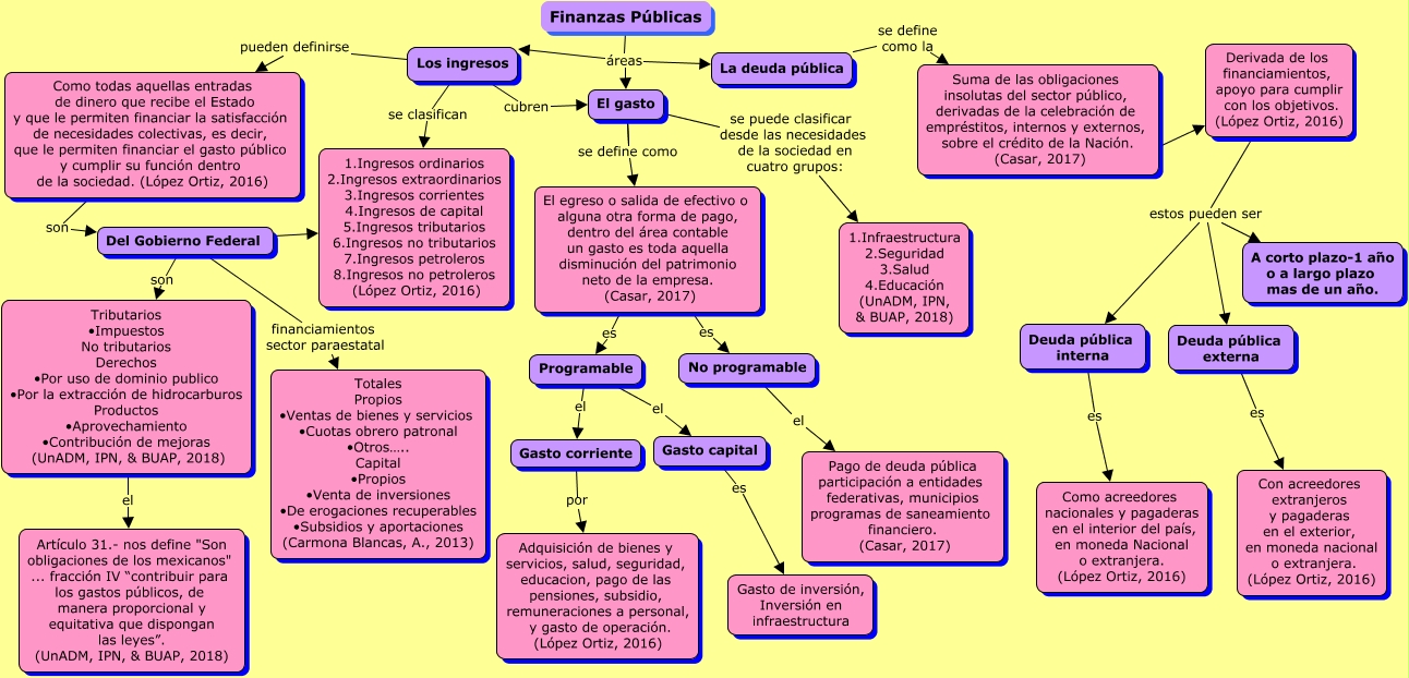 Este Cmap, tiene información relacionada con: Mapa conceptual finanzas publicas actividad 2, Programable el Gasto capital, Finanzas Públicas áreas La deuda pública, El egreso o salida de efectivo o alguna otra forma de pago, dentro del área contable un gasto es toda aquella disminución del patrimonio neto de la empresa. (Casar, 2017) es No programable, Suma de las obligaciones insolutas del sector público, derivadas de la celebración de empréstitos, internos y externos, sobre el crédito de la Nación. (Casar, 2017) es Derivada de los financiamientos, apoyo para cumplir con los objetivos. (López Ortiz, 2016), Como todas aquellas entradas de dinero que recibe el Estado y que le permiten financiar la satisfacción de necesidades colectivas, es decir, que le permiten financiar el gasto público y cumplir su función dentro de la sociedad. (López Ortiz, 2016) son Del Gobierno Federal, No programable el Pago de deuda pública participación a entidades federativas, municipios programas de saneamiento financiero. (Casar, 2017), El egreso o salida de efectivo o alguna otra forma de pago, dentro del área contable un gasto es toda aquella disminución del patrimonio neto de la empresa. (Casar, 2017) es Programable, Finanzas Públicas áreas El gasto, Derivada de los financiamientos, apoyo para cumplir con los objetivos. (López Ortiz, 2016) estos pueden ser Deuda pública externa, La deuda pública se define como la Suma de las obligaciones insolutas del sector público, derivadas de la celebración de empréstitos, internos y externos, sobre el crédito de la Nación. (Casar, 2017), Del Gobierno Federal son Tributarios •Impuestos No tributarios Derechos •Por uso de dominio publico •Por la extracción de hidrocarburos Productos •Aprovechamiento •Contribución de mejoras (UnADM, IPN, & BUAP, 2018), Gasto corriente por Adquisición de bienes y servicios, salud, seguridad, educacion, pago de las pensiones, subsidio, remuneraciones a personal, y gasto de operación. (López Ortiz, 2016), Gasto capital es Gasto de inversión, Inversión en infraestructura, Deuda pública externa es Con acreedores extranjeros y pagaderas en el exterior, en moneda nacional o extranjera. (López Ortiz, 2016), Del Gobierno Federal financiamientos sector paraestatal Totales Propios •Ventas de bienes y servicios •Cuotas obrero patronal •Otros….. Capital •Propios •Venta de inversiones •De erogaciones recuperables •Subsidios y aportaciones (Carmona Blancas, A., 2013), Tributarios •Impuestos No tributarios Derechos •Por uso de dominio publico •Por la extracción de hidrocarburos Productos •Aprovechamiento •Contribución de mejoras (UnADM, IPN, & BUAP, 2018) el Artículo 31.- nos define "Son obligaciones de los mexicanos" ... fracción IV “contribuir para los gastos públicos, de manera proporcional y equitativa que dispongan las leyes”. (UnADM, IPN, & BUAP, 2018), Los ingresos se clasifican 1.Ingresos ordinarios 2.Ingresos extraordinarios 3.Ingresos corrientes 4.Ingresos de capital 5.Ingresos tributarios 6.Ingresos no tributarios 7.Ingresos petroleros 8.Ingresos no petroleros (López Ortiz, 2016), El gasto se define como El egreso o salida de efectivo o alguna otra forma de pago, dentro del área contable un gasto es toda aquella disminución del patrimonio neto de la empresa. (Casar, 2017), Programable el Gasto corriente, Deuda pública interna es Como acreedores nacionales y pagaderas en el interior del país, en moneda Nacional o extranjera. (López Ortiz, 2016)