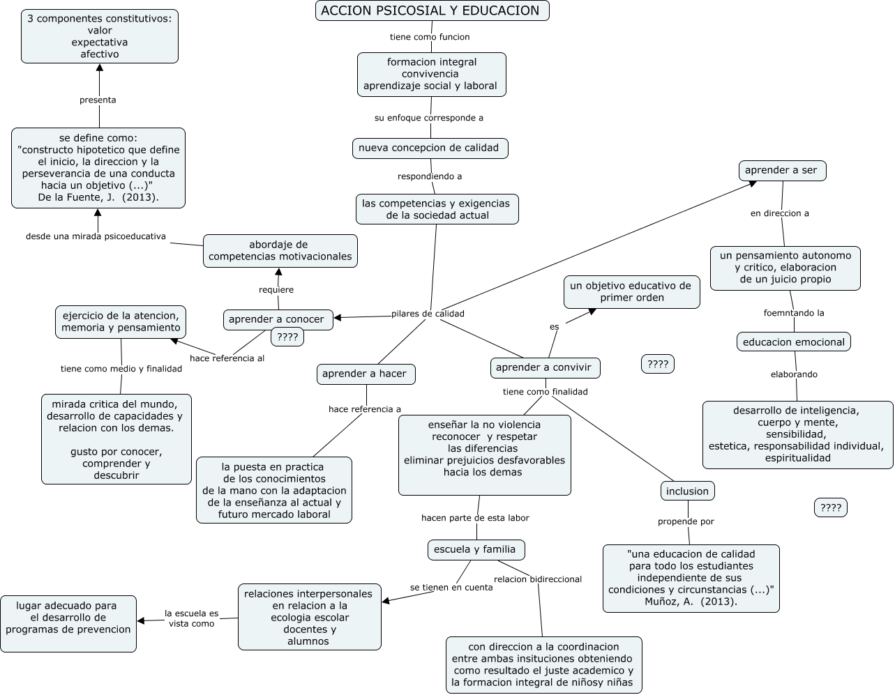 Este Cmap, tiene información relacionada con: accion psicosocial y educacion, enseñar la no violencia reconocer y respetar las diferencias eliminar prejuicios desfavorables hacia los demas hacen parte de esta labor escuela y familia, aprender a conocer requiere abordaje de competencias motivacionales, las competencias y exigencias de la sociedad actual pilares de calidad aprender a hacer, escuela y familia relacion bidireccional con direccion a la coordinacion entre ambas insituciones obteniendo como resultado el juste academico y la formacion integral de niñosy niñas, relaciones interpersonales en relacion a la ecologia escolar docentes y alumnos la escuela es vista como lugar adecuado para el desarrollo de programas de prevencion, las competencias y exigencias de la sociedad actual pilares de calidad aprender a convivir, ejercicio de la atencion, memoria y pensamiento tiene como medio y finalidad mirada critica del mundo, desarrollo de capacidades y relacion con los demas. gusto por conocer, comprender y descubrir, aprender a ser en direccion a un pensamiento autonomo y critico, elaboracion de un juicio propio, las competencias y exigencias de la sociedad actual pilares de calidad aprender a ser, un pensamiento autonomo y critico, elaboracion de un juicio propio foemntando la educacion emocional, nueva concepcion de calidad respondiendo a las competencias y exigencias de la sociedad actual, aprender a hacer hace referencia a la puesta en practica de los conocimientos de la mano con la adaptacion de la enseñanza al actual y futuro mercado laboral, ACCION PSICOSIAL Y EDUCACION tiene como funcion formacion integral convivencia aprendizaje social y laboral, educacion emocional elaborando desarrollo de inteligencia, cuerpo y mente, sensibilidad, estetica, responsabilidad individual, espiritualidad, aprender a convivir es un objetivo educativo de primer orden, aprender a conocer hace referencia al ejercicio de la atencion, memoria y pensamiento, inclusion propende por "una educacion de calidad para todo los estudiantes independiente de sus condiciones y circunstancias (...)" Muñoz, A. (2013)., las competencias y exigencias de la sociedad actual pilares de calidad aprender a conocer, se define como: "constructo hipotetico que define el inicio, la direccion y la perseverancia de una conducta hacia un objetivo (...)" De la Fuente, J. (2013). presenta 3 componentes constitutivos: valor expectativa afectivo, aprender a convivir tiene como finalidad enseñar la no violencia reconocer y respetar las diferencias eliminar prejuicios desfavorables hacia los demas