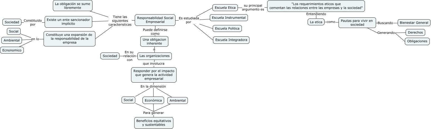 Este Cmap, tiene información relacionada con: Responsabilidad social, Responsabilidad Social Empresarial Es estudiada por Escuela Instrumental, Responder por el impacto que genera la actividad empresarial En la dimensión Económica, Las organizaciones En su relación con Sociedad, Constituye una expansión de la responsabilidad de la empresa en lo Ecnonomico, La etica como Pautas para vivir en sociedad, Económica Para generar Beneficios equitativos y sustentables, Constituye una expansión de la responsabilidad de la empresa en lo Ambiental, Pautas para vivir en sociedad Generando Obligaciones, Responsabilidad Social Empresarial Es estudiada por Escuela Integradora, Social Para generar Beneficios equitativos y sustentables, "Los requerimientos eticos que cementan las relaciones entre las empresas y la sociedad" Entendiendo La etica, Ambiental Para generar Beneficios equitativos y sustentables, Una obligacion inherente a Las organizaciones, Responsabilidad Social Empresarial Puede definirse como Una obligacion inherente, Constituye una expansión de la responsabilidad de la empresa en lo Social, Las organizaciones que involucra Responder por el impacto que genera la actividad empresarial, Pautas para vivir en sociedad Generando Derechos, Existe un ente sancionador implicito Constituido por Sociedad, Responsabilidad Social Empresarial Tiene las siguientes caracteristicas Existe un ente sancionador implicito, Responsabilidad Social Empresarial Es estudiada por Escuela Etica