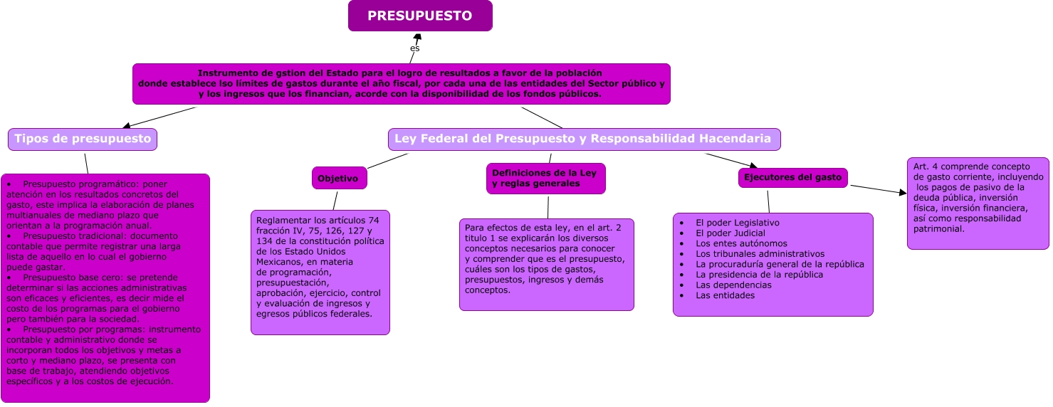 Este Cmap, tiene información relacionada con: presupuesto, Ejecutores del gasto ???? Art. 4 comprende concepto de gasto corriente, incluyendo los pagos de pasivo de la deuda pública, inversión física, inversión financiera, así como responsabilidad patrimonial., Ley Federal del Presupuesto y Responsabilidad Hacendaria ???? Ejecutores del gasto, Ley Federal del Presupuesto y Responsabilidad Hacendaria ???? Objetivo, Instrumento de gstion del Estado para el logro de resultados a favor de la población donde establece lso límites de gastos durante el año fiscal, por cada una de las entidades del Sector público y y los ingresos que los financian, acorde con la disponibilidad de los fondos públicos. ???? Tipos de presupuesto, Tipos de presupuesto ???? • Presupuesto programático: poner atención en los resultados concretos del gasto, este implica la elaboración de planes multianuales de mediano plazo que orientan a la programación anual. • Presupuesto tradicional: documento contable que permite registrar una larga lista de aquello en lo cual el gobierno puede gastar. • Presupuesto base cero: se pretende determinar si las acciones administrativas son eficaces y eficientes, es decir mide el costo de los programas para el gobierno pero también para la sociedad. • Presupuesto por programas: instrumento contable y administrativo donde se incorporan todos los objetivos y metas a corto y mediano plazo, se presenta con base de trabajo, atendiendo objetivos específicos y a los costos de ejecución., Ley Federal del Presupuesto y Responsabilidad Hacendaria ???? Definiciones de la Ley y reglas generales, Objetivo ???? Reglamentar los artículos 74 fracción IV, 75, 126, 127 y 134 de la constitución política de los Estado Unidos Mexicanos, en materia de programación, presupuestación, aprobación, ejercicio, control y evaluación de ingresos y egresos públicos federales., Instrumento de gstion del Estado para el logro de resultados a favor de la población donde establece lso límites de gastos durante el año fiscal, por cada una de las entidades del Sector público y y los ingresos que los financian, acorde con la disponibilidad de los fondos públicos. es PRESUPUESTO, Instrumento de gstion del Estado para el logro de resultados a favor de la población donde establece lso límites de gastos durante el año fiscal, por cada una de las entidades del Sector público y y los ingresos que los financian, acorde con la disponibilidad de los fondos públicos. es PRESUPUESTO, Definiciones de la Ley y reglas generales ???? Para efectos de esta ley, en el art. 2 titulo 1 se explicarán los diversos conceptos necesarios para conocer y comprender que es el presupuesto, cuáles son los tipos de gastos, presupuestos, ingresos y demás conceptos., Instrumento de gstion del Estado para el logro de resultados a favor de la población donde establece lso límites de gastos durante el año fiscal, por cada una de las entidades del Sector público y y los ingresos que los financian, acorde con la disponibilidad de los fondos públicos. ???? Ley Federal del Presupuesto y Responsabilidad Hacendaria, Ejecutores del gasto ???? • El poder Legislativo • El poder Judicial • Los entes autónomos • Los tribunales administrativos • La procuraduría general de la república • La presidencia de la república • Las dependencias • Las entidades